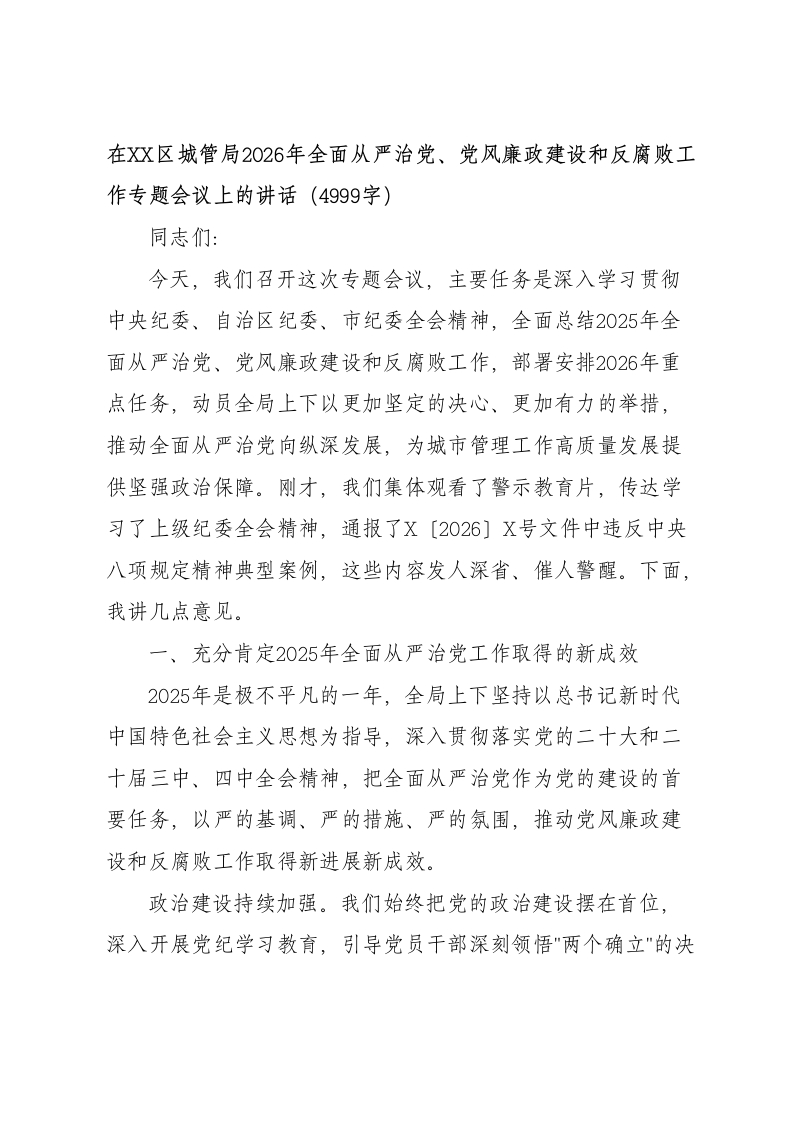 在X区城管局2026年全面从严治党、党风廉政建设和反腐败工作专题会议上的讲话(4999字)同志们:今天,我们召开这次专题会议,主要任务是深入学习贯彻中央纪委、自治区纪委、市纪委全会精神,全面总结2025年全面从严治党、党风廉政建设和反腐败工作,部署安排2026年重点任务,动员全局上下以更加坚定的决心、更加有力的举措,推动全面从严治党向纵深发展,为城市管理工作高质量发展提供坚强政治保障。刚才,我们集体观看了警示教育片,传达学习了上级纪委全会精神,通报了X[2026]X号文件中违反中央八项规定精神典型案例,这些内容发人深省、