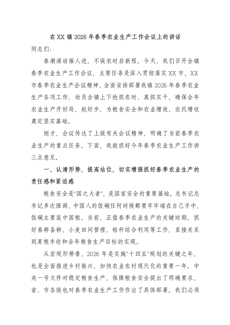 在X镇2026年春季农业生产工作会议上的讲话同志们:春潮涌动催人进,不误农时启新程。今天,我们召开全镇春季农业生产工作会议,主要任务是深入贯彻落实X市、XX市春季农业生产会议精神,全面安排部署我镇2026年春季农业生产各项工作,动员全镇上下抢抓农时、真抓实干,确保全年农业生产开好局、起好步,为粮食安全和农业增效、农民增收奠定坚实基础。刚才,会议传达了上级有关会议精神,明确了当前春季农业生产的重点任务。下面,我就抓好今年春季农业生产工作讲三点意见。一、认清形势、提高站位,切实增强抓好春季农业生产的责任感和紧迫