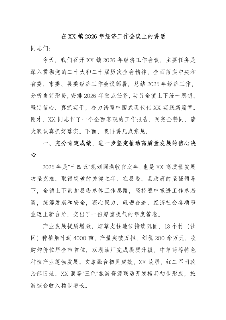 在XX镇2026年经济工作会议上的讲话同志们:今天,我们召开X镇2026年经济工作会议,主要任务是深入贯彻党的二十大和二十届历次全会精神,全面落实中央和省委、市委、县委经济工作会议部署,总结2025年经济工作,分析当前形势,安排2026年重点任务,动员全镇上下统一思想、坚定信心、真抓实干,奋力谱写中国式现代化X实践新篇章。刚才,XX同志作了一个全面客观的工作报告,我完全赞同,请大家认真抓好落实。下面,我再讲几点意见。一、充分肯定成绩,进一步坚定推动高质量发展的信心决心2025年是"十四五"规划圆满收官之年,也是XX高质量发展
