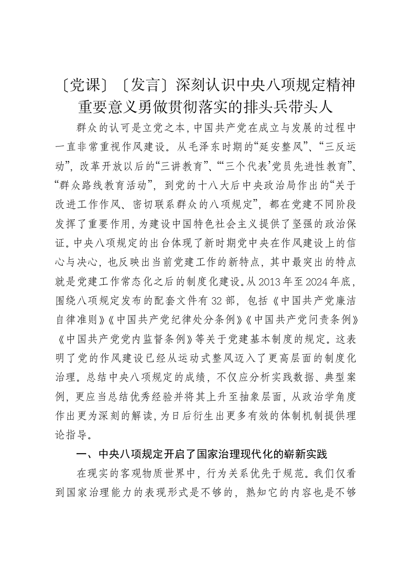 〔党课)〔发言〕深刻认识中央八项规定精神重要意义勇做贯彻落实的排头兵带头人群众的认可是立党之本,中国共产党在成立与发展的过程中一直非常重视作风建设。从毛泽东时期的“延安整风”、“三反运动”,改革开放以后的“三讲教育”、“三个代表’党员先进性教育”、“群众路线教育活动”,到党的十八大后中央政治局作出的“关于改进工作作风、密切联系群众的八项规定”,都在党建不同阶段发挥了重要作用,为建设中国特色社会主义提供了坚强的政治保证。中央八项规定的出台体现了新时期党中央在作风建设上的信心与决心,也反映出当前党建工作的新特点,其中最突出的特点就是党建工作常态化之后的制度化建设。从2013年至2024年底,围绕八项规定发布的配套文件有32部,包括《中国共产党廉洁自律准则》《中国共产党纪律处分条例》《中国共产党问责条例》《中国共产党党内监督条例》等关于党建基本制度的规定。这表明了党的作风建设已经从运动式整风迈入了更高层面的制度化治理。总结中央八项规定的成绩,不仅应分析实践数据、典型案例,更应当总结优秀经验并将其上升至抽象层面,从政治学角度作出更为深刻的解读,为日后衍生出更多有效的体制机制提供理论指导。一、中央八项规定开启了国家治理现代化的崭新实践在现实的客观物质世界中,行为关系优先于规范。我们仅看到国家治理能力的表现形式是不够的,熟知它的内容也是不够的,还必须深入发现其所蕴含的内容在生活中,即在社会关系中得以履行的事实基础,以便总结经验,完善我们的制度体系。了解一项规则体系应当了解其产生于什么样的激励动机,这离不开对这一规则体系产生影响的体制内外社会成员的了解,所以关于八项规定的研究、互动、训练以及观念的传播都是十分必要的。作为形式的规则体系并不存在于人们的头脑和理论中,其与真实历史十分相似,是一种思想体系,也是一种关系的体系。规则的树立是一个思想的过程,更加是一个使得人与人之间关系规范化、秩序化、科学化的真实过程。这个规范化、秩序化和科学化的过程伴随着经济基础的发展,在整个社会产生客观自然的、普遍深远的变革。党员干部的社会行为甚至日常行为都有可能关系到党执政地位的巩固和国家的有效治理。党员行为从根本上影响党建工作,党建工作又从根本上影响着国家治理现代化的实现。中国共产党是中国特色社会主义事业的领导核心,领导一切。从本质上看,政党治理与国家治理具有同构性,党的执政能力建设与国家治理能力建设是一体的。全面从严治党,提高党的执政能力,也是在同步提升国家治理能力。制度的生命力在于实践。中央八项规定是新时代党执政能力建设的一项具体举措,其实践性强,反映出党建工作中存在的社会基本关系,为国家治理能力研究提供了有效参考。中央八项规定产生于社会实践,作用于社会实践,具有很强的生命力,是从严治党的逻辑起点,也是治国理政创新