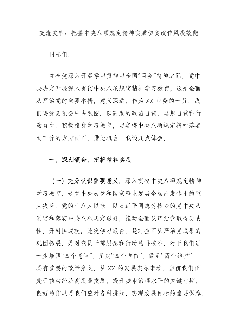 交流发言:把握中央八项规定精神实质切实改作风提效能同志们:在全党深入开展学习贯彻习全国“两会”精神之际,党中央决定开展深入贯彻中央八项规定精神学习教育,这是全面从严治党的重要举措,意义深远。作为XX市委的一员,我们要深刻领会中央意图,以高度的政治自觉、思想自觉和行动自觉,积极投身学习教育,切实将中央八项规定精神落实到工作的方方面面。借此机会,我谈几点体会。一、深刻领会,把握精神实质(一)充分认识重要意义。深入贯彻中央八项规定精神学习教育,是党中央从党和国家事业发展全局出发作出的重大决策。党的十八大以来,以习近平同志为核心的党中央从制定和落实中央八项规定破题,推动全面从严治党取得历史性、开创性成就。此次学习教育,是对全面从严治党成果的巩固拓展,是对党员干部思想和行动的再校准,对于我们进一步增强“四个意识”、坚定“四个自信”、做到“两个维护”,具有重要的政治意义。从X的发展实际来看,当前我们正处于推动经济高质量发展、提升城市治理水平的关键时期。良好的作风是我们应对各种挑战、实现发展目标的重要保障。通过学习教育,我们能够更好地凝聚全市党员干部的力量,以更加昂扬的斗志、更加务实的作风,投入到X的建设发展中。(二)准确把握核心要求。中央八项规定精神,涵盖了改进调查研究、精简会议活动、精简文件简报、规范出访活动、改进警卫工作、改进新闻报道、厉行勤俭节约等多个方面,核心是密切联系群众,切实改进工作作风。我们在学习教育中,要深入学习习近平总书记关于加强党的作风建设的重要论述,准确把握中央八项规定精神的内涵和实质。要坚持问题导向,对照自身工作,查找在落实中央八项规定精神方面存在的不足和差距,有的放矢地进行整改。同时,要注重将学习教育与日常工作相结合,将中央八项规定精神融入到各项工作制度和流程中,形成常态化、长效化的工作机制。(三)全面总结显著成效。党的十八大以来,我市在贯彻中央八项规定精神方面取得了显著成效。会议活动更加精简高效,文件简报数量大幅减少,调查研究更加深入务实,“三公”经费支出明显下降。这些成效,不仅提升了政府的工作效率和公信力,也赢得了人民群众的广泛认可和支持。通过精简会议和文件,我们将更多的时间和精力投入到实际工作中,推动了一系列重点项目和民生工程的顺利实施。同时,我们也应该清醒地认识到,作风建设永远在路上,我们不能