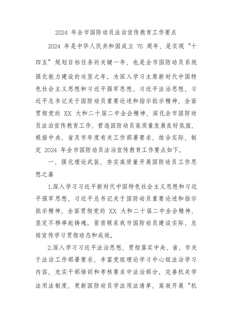 2024年全市国防动员法治宣传教育工作要点2024年是中华人民共和国成立75周年,是实现"十四五”规划目标任务的关键一年,也是全市国防动员系统强化能力建设的攻坚之年。为深入学习主席新时代中国特色社会主义思想和习近平强军思想、习近平法治思想、习近平总书记关于国防动员重要论述和指示批示精神,全面贯彻党的XX大和二十届二中全会精神,深化全市国防动员法治宣传教育工作,营造国防动员高质量发展良好氛围,根据中央、省及市年度有关工作部署要求,结合实际,制定2024年全市国防动员法治宣传教育工作要点如下。一、强化理论武装,夯实高质量开展国防动员工作思想之基1.深入学习习近平新时代中国特色社会主义思想和习近平强军思想、习近平总书记关于国防动员重要论述和指示批示精神,全面贯彻党的X大和二十届二中全会精神,坚定不移举起铸魂。紧密联系我市国防动员建设实际,总结宣传学习贯彻动态和成效。2.深入学习习近平法治思想,贯彻落实中央、省、市关于法治工作部署要求,丰富党组理论学习中心组法治学习内容,充实干部培训和考核要求中法治部分。完善机关学法用法制度,更新国防动员学法用法清单,高效开展“机关集中学法月”主题学法活动,定期组织多种形式的集中学习。持续加强法治培训,做好工作人员法治素养提升工作。全年举办两次以上法治专题讲座。三季度主要负责人讲授专题法治课,邀请市“八五”普法宣讲团开展普法、以案释法宣讲。二、深化法治建设,营造高质量开展国防动员工作良好环境3.贯彻落实国家、省国防动员法律法规以及新制定的军事设施保护等政策,落实党政主要负责人履行推进法治建设第一责任人职责要求,规范部门职责权限,调整部门权责清单,落实“全省一单”。定期开展规范性文件清理,严格规范性文件备案、合法性审查及公平竞争审查要求。上半年,开展全市国动系统行政审批案卷评查,组织执法人员专门法律知识培训,开展专业知识和党内法规测试1次,组织参加全省国防动员行政执法资格考试。4.全面落实“谁执法谁普法”普法责任制,积极开展多种形式普法宣传活动。落实“综合查一次”“双随机、一公开”事中事后监管制度,强化执法监督检查。严格落实政务公开和“双公示”要求,及时发布和更新依法应主动公开的政务信息,营造主动公开、成果共享的良好社会氛