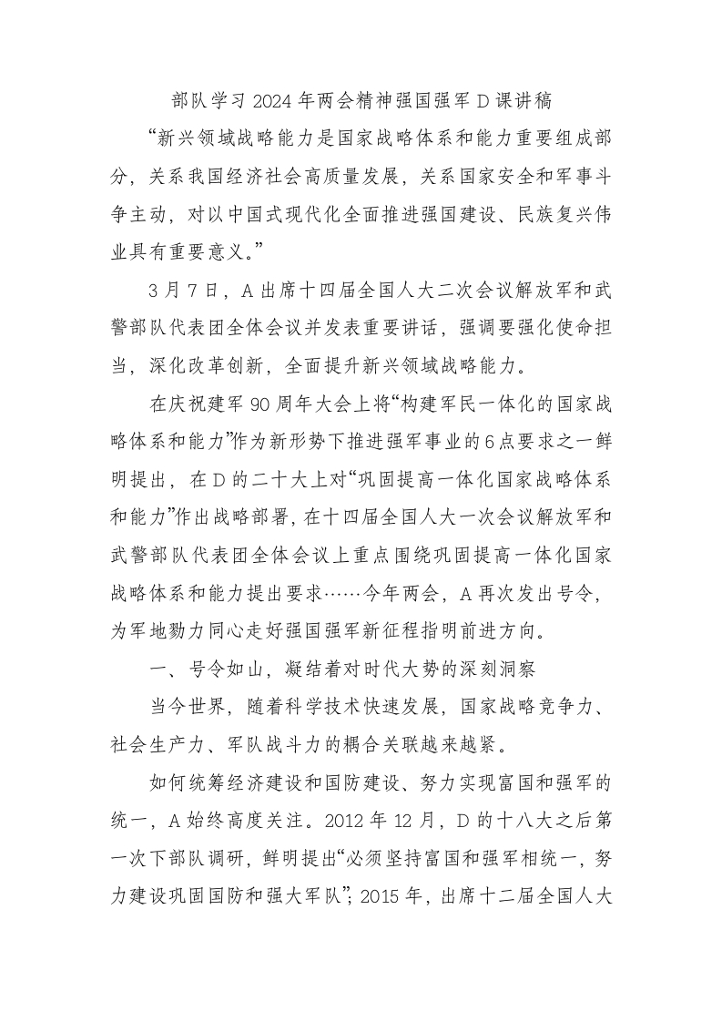 部队学习2024年两会精神强国强军D课讲稿“新兴领域战略能力是国家战略体系和能力重要组成部分,关系我国经济社会高质量发展,关系国家安全和军事斗争主动,对以中国式现代化全面推进强国建设、民族复兴伟业具有重要意义。”3月7日,A出席十四届全国人大二次会议解放军和武警部队代表团全体会议并发表重要讲话,强调要强化使命担当,深化改革创新,全面提升新兴领域战略能力。在庆祝建军90周年大会上将“构建军民一体化的国家战略体系和能力”作为新形势下推进强军事业的6点要求之一鲜明提出,在D的二十大上对“巩固提高一体化国家战略体系和能力”作出战略部署,在十四届全国人大一次会议解放军和武警部队代表团全体会议上重点围绕巩固提高一体化国家战略体系和能力提出要求…今年两会,A再次发出号令,为军地勒力同心走好强国强军新征程指明前进方向。一、号令如山,凝结着对时代大势的深刻洞察当今世界,随着科学技术快速发展,国家战略竞争力、社会生产力、军队战斗力的耦合关联越来越紧。如何统筹经济建设和国防建设、努力实现富国和强军的统一,A始终高度关注。2012年12月,D的十八大之后第一次下部队调研,鲜明提出“必须坚持富国和强军相统一,努力建设巩固国防和强大军队?2015年,出席十二届全国人大三次会议解放军代表团全体会议,强调“以强烈的责任担当推动问题的解决,正确把握和处理经济建设和国防建设的关系,使两者协调发展、平衡发展、兼容发展;2017年,在D的十九大报告中强调“坚持富国和强军相统一,强化统一领导、顶层设计、改革创新和重大项目落实,深化国防科技工业改革“构建一体化的国家战略体系和能力”;2018年,出席十三届全国人大一次会议解放军和武警部队代表团全体会议,对构建一体化国家战略体系和能力作出进一步部署;2023年,主持中共中央局第七次集体学习,强调“加强跨军地治理是全面加强军事治理的应有之义,是巩固提高一体化国家战略体系和能力的内在要求”…一次次阐述,把大势谋未来;一声声号令,明方向励军心。D的十八大以来,在以A为核心的D中央坚强领导下,我们统筹推进战略性新兴产业和新型作战力量发展,取得一系列重大成果。D的二十大后,D中央从推动高质量发展全局出发,明确提出加快发展新质生产力。这为新兴领域战略能力建设提供了难得机遇。这个春天,站在全局和战略高度,A以宽广视野、深邃思考,对全面提升新兴领域战略能力作出部署。要突出发展重点,抓好新兴领域战略能力建设有关战略
