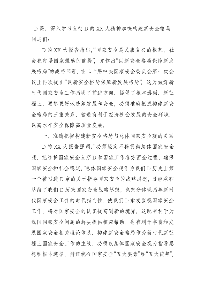 D课:深入学习贯彻D的X大精神加快构建新安全格局同志们:D的X大报告指出,“国家安全是民族复兴的根基,社会稳定是国家强盛的前提”并作出“以新安全格局保障新发展格局”的战略部署。在二十届中央国家安全委员会第一次会议上再次提出“以新安全格局保障新发展格局”这为做好新时代国家安全工作指明了前进方向、提供了根本遵循。新征程上,要想更好地统筹发展和安全,必须准确把握构建新安全格局的三重关系,营造有利于经济社会发展的安全环境,以高水平安全保障高质量发展。一、准确把握构建新安全格局与总体国家安全观的关系D的X大报告强调:“必须坚定不移贯彻总体国家安全观,把维护国家安全贯穿D和国家工作各方面全过程,确保国家安全和社会稳定。”总体国家安全观作为我们D历史上第一个被写进D章的关于指导国家安全的战略思想,既继承和总结了我们D历来国家安全战略思想,也充分体现指导新时代国家安全工作的时代指向性,使我们D愈发重视国家安全工作,将对国家安全的认识提高到新的境界。这既有利于为我国国家安全问题的解决提供相应帮助,也有利于丰富和发展国家安全相关理论体系。构建新安全格局作为新时代新征程上国家安全工作的主线,必须以总体国家安全观为指导思想和根本遵循,辩证统合国家安全“五大要素”和“五大统筹”,既要精准把握国家安全形势新特点新趋势,又要坚持“两点论”和“重点论”相统一,加强对涉及国家安全资源和能源、体制和机制、法律和制度、能力和技术、精神和文化等不同要素的“谋篇布局”,坚决维护国家主权、安全、发展利益,推动建设更高水平的平安中国,为全面建成社会主义现代化国家提供坚强保障,保证国家安全这一头等大事。二、准确把握构建新安全格局与构建新发展格局的关系D的X大报告指出:“必须完整、准确、全面贯彻新发展理念,加快构建以国内大循环为主体、国内国际双循环相互促进的新发展格局。”这充分表明高质量发展的实质是满足人民对美好生活愈来愈高的需求,是对新发展理念的一种全新诠释。新发展格局作为D中央立足实现第二个百年奋斗目标、统筹发展和安全作出的战略决策,也是贯彻新发展理念、推动高质量发展的重大举措。随着我国发展环境面临深刻复杂的变化,安全对于发展的意义凸显,安全在发展中的分量加重,提高对安全的认知,在发展中更多注重思考安全方面的因素,统筹发展和安全,是构建新发展格局的出发点和落脚点。新时代新征程上“两个格局”的统筹构建,既是统筹发展和安全理念的一种较为全面直观的体现,也是D中央基于我国所遵循的中华民族伟大复兴战略全局角度审时度势的战略部署。发展和安全历来都是关涉人类命运的永恒主题,也是一个国家所要面对的两件大事。对于我国来说,发展和