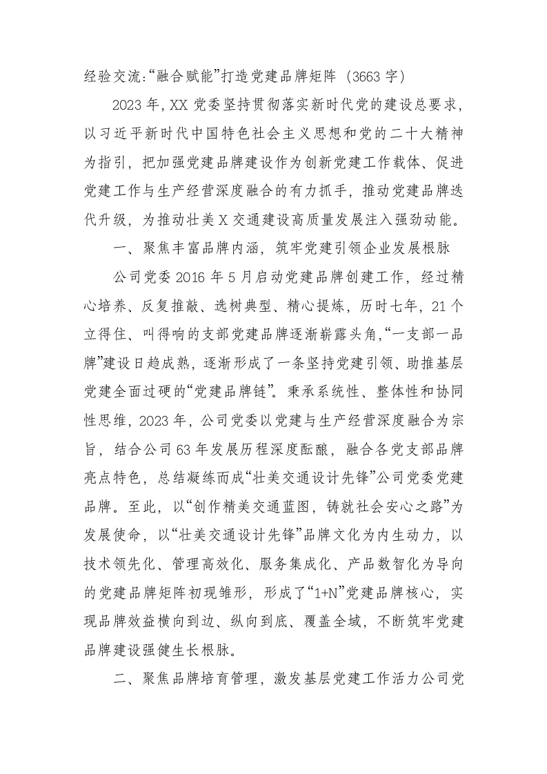 经验交流:“融合赋能”打造党建品牌矩阵(3663字)2023年,X党委坚持贯彻落实新时代党的建设总要求,以习近平新时代中国特色社会主义思想和党的二十大精神为指引,把加强党建品牌建设作为创新党建工作载体、促进党建工作与生产经营深度融合的有力抓手,推动党建品牌迭代升级,为推动壮美X交通建设高质量发展注入强劲动能。一、聚焦丰富品牌内涵,筑牢党建引领企业发展根脉公司党委2016年5月启动党建品牌创建工作,经过精心培养、反复推敲、选树典型、精心提炼,历时七年,21个立得住、叫得响的支部党建品牌逐渐崭露头角,“一支部一品牌”建设日趋成熟,逐渐形成了一条坚持党建引领、助推基层党建全面过硬的“党建品牌链”。秉承系统性、整体性和协同性思维,2023年,公司党委以党建与生产经营深度融合为宗旨,结合公司63年发展历程深度酝酿,融合各党支部品牌亮点特色,总结凝练而成“壮美交通设计先锋”公司党委党建品牌。至此,以“创作精美交通蓝图,铸就社会安心之路”为发展使命,以“壮美交通设计先锋”品牌文化为内生动力,以技术领先化、管理高效化、服务集成化、产品数智化为导向的党建品牌矩阵初现雏形,形成了“1+N”党建品牌核心,实现品牌效益横向到边、纵向到底、覆盖全域,不断筑牢党建品牌建设强健生长根脉。二、聚焦品牌培育管理,激发基层党建工作活力公司党委着力强化品牌创建的谋篇布局,对重点培育的党建品牌进行实时跟踪、及时反馈、强化提升,以党建品牌建设激发基层党建工作活力。“1+N”融合赋能,激发党建品牌矩阵发展力。坚持统筹规划,加强顶层设计,精心制定“壮美交通设计先锋”党建品牌创建方案。通过开展“深化党建品牌创建”专项工作,指导各党支部充分结合公司党建品牌方案内容,进一步深化支部党建品牌内涵,通过支部品牌升级达成“主品牌+子品牌”协同联动的良好效应,进而通过深度发挥品牌作用凝神聚力,切实做到党建品牌矩阵质量和效能双提升。丰富建设路径,深耕厚培全面强化品牌意识。近三年,公司党委通过选育、宣传、表彰等方式多渠道多种类开展党建品牌建设工作。2016年起每年不定期,公司召开党建品牌展示评比交流会、优秀党建品牌经验分享会、“说出你的品牌故事”演讲比赛等,搭建党支部间相互学习借鉴的平台,厚植品牌创建意识,营造比、学、赶、超的干事创业氛围。通过重点培育与支部所辖部门、子公司主业专业融合度高,坚持党建引领促生产经营成效明显的支部品牌向上级党委推荐,推动支部品牌影响力带动部门、子公司专业技术服务取得更大更深远的社会效应和经济效益。细化管理模式,以品牌效应检验支部工作成果。公司党委始终致力于把党建工作融入生产经营,将品牌创建引领经