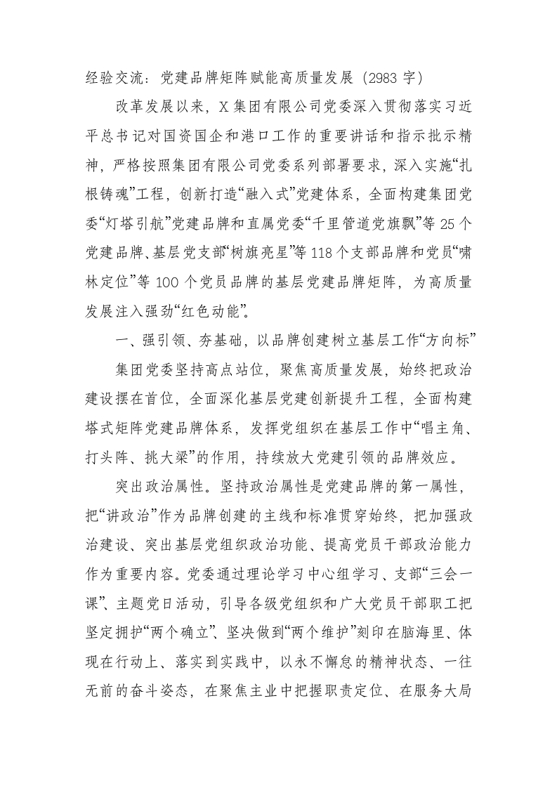 经验交流:党建品牌矩阵赋能高质量发展(2983字)改革发展以来,X集团有限公司党委深入贯彻落实习近平总书记对国资国企和港口工作的重要讲话和指示批示精神,严格按照集团有限公司党委系列部署要求,深入实施“扎根铸魂”工程,创新打造“融入式”党建体系,全面构建集团党委“灯塔引航”党建品牌和直属党委“千里管道党旗飘”等25个党建品牌、基层党支部树旗亮星”等118个支部品牌和党员“啸林定位”等100个党员品牌的基层党建品牌矩阵,为高质量发展注入强劲“红色动能”一、强引领、夯基础,以品牌创建树立基层工作“方向标”集团党委坚持高点站位,聚焦高质量发展,始终把政治建设摆在首位,全面深化基层党建创新提升工程,全面构建塔式矩阵党建品牌体系,发挥党组织在基层工作中“唱主角、打头阵、挑大梁”的作用,持续放大党建引领的品牌效应。突出政治属性。坚持政治属性是党建品牌的第一属性,把“讲政治”作为品牌创建的主线和标准贯穿始终,把加强政治建设、突出基层党组织政治功能、提高党员干部政治能力作为重要内容。党委通过理论学习中心组学习、支部“三会一课”、主题党日活动,引导各级党组织和广大党员干部职工把坚定拥护“两个确立”、坚决做到“两个维护”刻印在脑海里、体现在行动上、落实到实践中,以永不懈怠的精神状态、一往无前的奋斗姿态,在聚焦主业中把握职责定位、在服务大局中积极担当作为,为品牌建设提供坚强政治保障。强化品牌管理。以“抓提升、创示范、育品牌”为主线,聚焦创新,贯穿融合,充分挖掘提炼党建品牌的内涵和价值。按照品牌规划、品牌创建、品牌申报、品牌选树、品牌推广、品牌评估等步骤,各直属党组织不断凝练提升,建设形成极具自身特色的党建品牌,用品牌理念带动生产发展、用品牌形象展示单位党建。建立“书记抓、抓书记”工作机制,围绕基层“堵点、痛点、难点”问题,实施直属党组织书记抓基层党建领办突破项目25项,并组织开展“头雁领飞擂台赛,充分发挥书记“挂帅作战”示范效应,持续放大党建引领作用,推动品牌管理实践。聚力基层基础。全面深化落实集团公司基层党建创新提升工程,充分发挥基层党建的政治优势、组织优势和制度优势,强化党建工作在基层治理基层建设的引领作用、示范作用和带动作用。通过自上而下的“大培训、大比赛、强能力、强作风”系列活动,接续开展34大类87项“大比赛”项目,不断提高职工的技能水平。把落实集团党委决策部署、解决企业突出问题作为党建品牌建设的主阵地、主战场,确保基层党支部战斗堡垒作用进一步凸现,基层基础基本功更加扎实稳固。二、促共振、求实效,以品牌创建打造中心工作“强引擎”集团党委聚焦整合、融合、耦合“三合发展”,坚持业绩