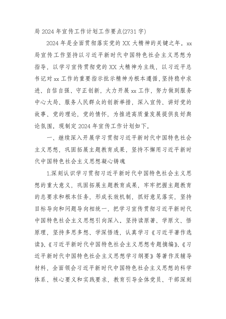 局2024年宣传工作计划工作要点(2731字)2024年是全面贯彻落实党的XX大精神的关键之年。xx局宣传工作坚持以习近平新时代中国特色社会主义思想为指导,以学习宣传贯彻党的XX大精神为主线,以习近平总书记对双工作的重要指示批示精神为根本遵循,坚持稳中求进、自信自强、守正创新,大力开展双工作,努力做到服务中心大局、服务人民群众的创新举措,深入宣传、讲好党的故事、党的理论,党的情怀,为推进高质量发展提供良好舆论氛围。现制定2024年宣传工作计划如下。一、继续深入开展学习贯彻习近平新时代中国特色社会主义思想,巩固拓展主题教育成果,坚持不懈用习近平新时代中国特色社会主义思想凝心铸魂1.深刻认识学习贯彻习近平新时代中国特色社会主义思想的重大意义,巩固拓展主题教育成果,牢牢把握主题教育的总要求和根本任务,形成长效机制,抓好意见落实,坚持目标导向和问题导向相统一,把学习宣传贯彻习近平新时代中国特色社会主义思想引向深入。坚持读原著、学原文、悟原理,坚持多思多想、学深悟透,认真学习《习近平著作选读》、《习近平新时代中国特色社会主义思想专题摘编》、《习近平新时代中国特色社会主义思想学习纲要》等著作及辅导材料,全面领会习近平新时代中国特色社会主义思想的科学体系、核心要义和实践要求,教育引导全体党员、干部深刻领悟“两个确定”的决定性意义,增强“四个意识”、坚定“四个自信”做到“两个维护”,始终在思想上政治上行动上同以习近平同志为核心的党中央保持高度一致。2.以党委理论学习中心组为引领、以各党支部为基础,利用领导干部读书班、“三会一课”集中学习等时机,通过交流研讨、宣讲阐释等方式,抓好党员、干部集中学习。以主题党日活动为载体,结合常态化长效化党史学习教育,将市红色教育资源和党性教育基地作为主题党日活动场所,开展案例教学、现场教学等活动,增强学习的针对性、实效性和感染力。利用共产党员网、旗帜网、学习强国APP、干部在线学习等载体平台,组织开展研讨交流、参观展览、学习分享等活动,充分调动党员、干部加强自学的主动性。3.继续在内部OA网开设教育专栏,用好“一网一微一刊”宣传平台,及时宣传报道开展教育的新进展、新举措、新成效,积极发挥好“xx大讲堂”作用,开展理想信念、职业道德和职业技能教育培训,提升党员、干部综合素质。深入贯彻落实习近平总书记对燃工作的重要指示批示精神,学习习近平总书记关于燃工作的重要论述,深刻理解其核心要义和实践要求,大力宣传习近平新时代中国特色社会主义思想在的生动实践,及时宣传运用党的创新理论破解燃工作发展难题的经验做法,推动X局学习宣传贯彻习近平新时代中国特色社会主义思想呈现新气象、谱写新篇章。4.认真学习习近