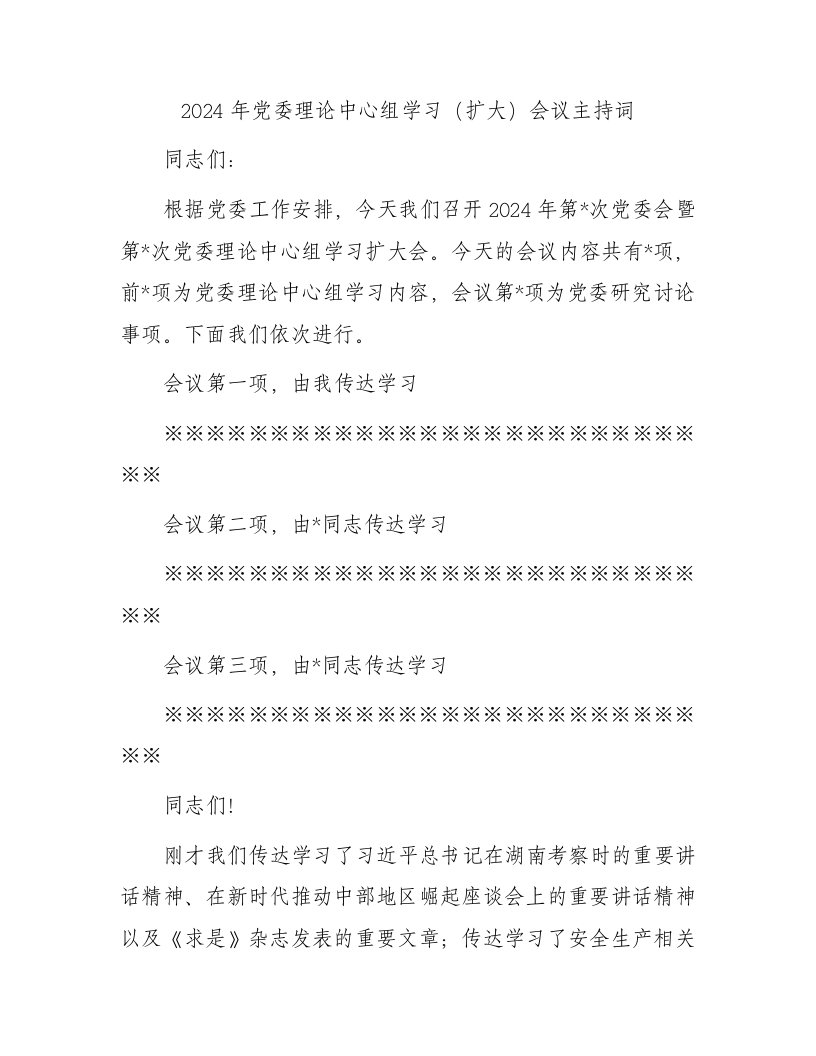 2024年党委理论中心组学习(扩大)会议主持词同志们:根据党委工作安排,今天我们召开2024年第*次党委会暨第*次党委理论中心组学习扩大会。今天的会议内容共有*项,前*项为党委理论中心组学习内容,会议第*项为党委研究讨论事项。下面我们依次进行。会议第一项,由我传达学习会议第二项,由*同志传达学习会议第三项,由*同志传达学习刚才我们传达学习了习近平总书记在湖南考察时的重要讲话精神、在新时代推动中部地区崛起座谈会上的重要讲话精神以及《求是》杂志发表的重要文章;传达学习了安全生产相关指示批示和会议精神。这些内容都与我们的工作息息相关,对我们武装头脑、指导实践、推动工作具有重要意义,大家下去之后一定要常学常新、深学细悟。下面,我结合当前重点工作再强调三点意见,请大家认真对照、主动认领,积极抓好落实。一、始终把安全环保作为头等大事抓牢抓实各部门各单位要深入学习贯彻习近平总书记关于安全生产的重要指示批示精神和省委、市委常委会会议精神,提高站位、认清形势,压实责任、务实举措,把安全生产、环境保护、社会稳定等工作放在经济发展的第一位。由*同志牵头,*部门负责,各部门各单位积极配合,深刻汲取各地发生的燃气爆炸事故教训,聚焦燃气安全、道路交通、建筑施工、消防安全、危险化学品、特种设备和有限空间作业等重点领域,从严从紧、从实从细全面做好安全防范工作;要聚焦建设生态文明高地上的高质量现代化工业园区目标定位,全面做好中央环保督察“后半篇”文章,全力推进生态环保持续向好。由*同志牵头,*等部门负责,全面做好塔尔山、九眼泉山森林防火工作,加强火源管控、严控火源入山,坚决把火源控制在林区之外,筑牢森林防火安全底线,确保人民群众生命财产和森林资源的安全。同时,由*等部门负责,认真做好“敏感期”维稳安保工作,紧