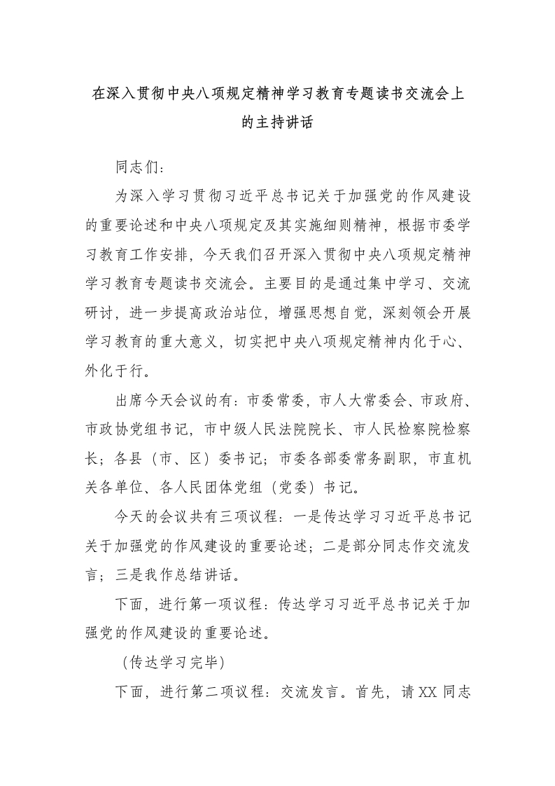 在深入贯彻中央八项规定精神学习教育专题读书交流会上的主持讲话同志们:为深入学习贯彻习近平总书记关于加强党的作风建设的重要论述和中央八项规定及其实施细则精神,根据市委学习教育工作安排,今天我们召开深入贯彻中央八项规定精神学习教育专题读书交流会。主要目的是通过集中学习、交流研讨,进一步提高政治站位,增强思想自觉,深刻领会开展学习教育的重大意义,切实把中央八项规定精神内化于心、外化于行。出席今天会议的有:市委常委,市人大常委会、市政府、市政协党组书记,市中级人民法院院长、市人民检察院检察长;各县(市、区)委书记;市委各部委常务副职,市直机关各单位、各人民团体党组(党委)书记。今天的会议共有三项议程:一是传达学习习近平总书记关于加强党的作风建设的重要论述;二是部分同志作交流发言;三是我作总结讲话。下面,进行第一项议程:传达学习习近平总书记关于加强党的作风建设的重要论述。(传达学习完毕)下面,进行第二项议程:交流发言。首先,请X同志发言。(发言完毕)请X同志发言。(发言完毕)请X同志发言。(发言完毕)由于时间关系,交流发言就进行到这里。刚才,几位同志结合工作实际,谈了认识体会,讲得都很好,听后很受启发。大家要以此次读书交流会为契机,持续深化学习,不断提高政治判断力、政治领悟力、政治执行力,把中央八项规定精神不折不扣落实到位。下面,我再讲几点意见。一、深化思想认识,增强贯彻落实的政治自觉党的十八大以来,以习近平同志为核心的党中央从制定和落实中央八项规定开局破题,持之以恒正风肃纪,党风政风为之一新,社风民风持续向上向善。实践充分证明,中央八项规定不是五年、十年的规定,而是长期有效的铁规矩、硬杠杠。当前,我们正处于全面建设社会主义现代化国家的关键时期,X作为国家中心城市,承担着引领全省发展的重任。面对新形势新任务,我们必须深刻认识到,贯彻落实中央八项规定精神,是坚定拥护“两个确立”坚决做到“两个维护”的具体行动,是推动X高质量发展、实现现代化建设目标的重要保障,是密切党同人民群众血肉联系、巩固党的