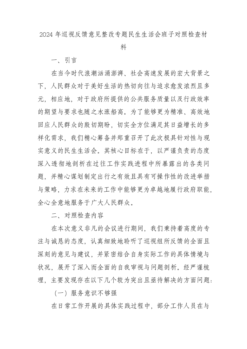 2024年巡视反馈意见整改专题民生生活会班子对照检查材料一、引言在当今时代浪潮汹涌澎湃、社会高速发展的宏大背景之下,人民群众对于美好生活的热切向往与追求愈发浓烈且多元,相应地,对于政府所提供的公共服务质量以及行政效率的期望与要求也随之水涨船高。为了能够更为精准、高效地回应人民群众的殷切期盼,切实全方位满足其日益增长的多样化需求,我们精心筹备并郑重召开了此次极具针对性与现实意义的民生生活会。其核心目标在于,以严谨负责的态度深入透彻地剖析在过往工作实践进程中所暴露出的各类问题,并精心谋划制定出行之有效且具有可操作性的改进举措与策略,力求在未来的工作中能够更为卓越地履行政府职能,全心全意地服务于广大人民群众。二、对照检查内容在本次意义非凡的会议进行期间,我们秉持着高度的专注与诚恳的态度,认真细致地聆听了巡视组所反馈的全面且深刻的意见与建议,并紧密结合自身实际工作的具体情境与状况,展开了深入而全面的自我审视与问题剖析。经严谨梳理,主要发现存在以下几个较为突出且亟待解决的方面问题:(一)服务意识不够强在日常工作开展的具体实践过程中,部分工作人员在与群众进行交互对接时,偶尔会显露出对群众态度冷漠疏离、服务不够周全细致的不良情形。这种现象的存在,直接致使群众在接受政府服务的过程中体验感不佳,进而对政府整体工作产生不满情绪与负面评价,严重损害了政府在人民群众心目中的形象与公信力。(二)工作效率低下由于现行工作流程设计不够合理,存在繁琐复杂的程序以及过多的环节设置,导致诸多事项在办理推进过程中耗费了大量的时间成本。这不仅使得群众的合理诉求无法得到及时有效的回应与满足,严重影响了群众的切身利益,而且在很大程度上削弱了群众对政府工作的信任度与满意度,对政府与群众之间的良好关系构建形成了较大阻碍。(三)沟通协调不畅在跨部门协作的工作场景中,部门之间尚未构建起一套行之有效且完善高效的沟通协调机制。这一缺失直接导致了信息传递的不顺畅、工作衔接的不紧密,许多工作任务往往需要经历多次反复的协调与沟通方能艰难推进完成。如此一来,不仅造成了大量宝贵时间资源与人力精力的无谓浪费,而且极大地降低了整体工作的推进效率与质量效果,严重制约了政府综合服务效能的充分发挥与提升。三、原因分析经过深入细致且全面系统的反思与分析,我们清晰且深