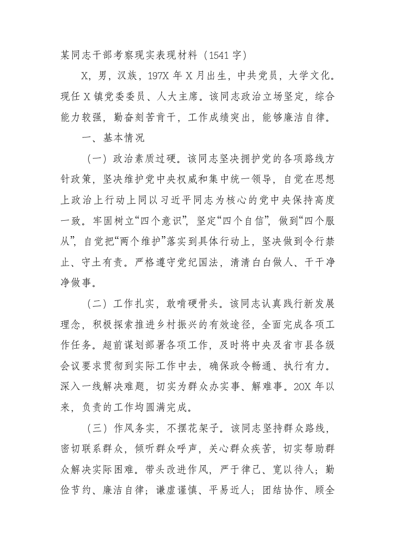 某同志干部考察现实表现材料(1541字)X,男,汉族,197X年X月出生,中共党员,大学文化。现任X镇党委委员、人大主席。该同志政治立场坚定,综合能力较强,勤奋刻苦肯干,工作成绩突出,能够廉洁自律。一、基本情况(一)政治素质过硬。该同志坚决拥护党的各项路线方针政策,坚决维护党中央权威和集中统一领导,自觉在思想上政治上行动上同以习近平同志为核心的党中央保持高度一致。牢固树立“四个意识”,坚定“四个自信”,做到“四个服从”,自觉把“两个维护”落实到具体行动上,坚决做到令行禁止、守土有责。严格遵守党纪国法,清清白白做人、干干净净做事。(二)工作扎实,敢啃硬骨头。该同志认真践行新发展理念,积极探索推进乡村振兴的有效途径,全面完成各项工作任务。超前谋划部署各项工作,及时将中央及省市县各级会议要求贯彻到实际工作中去,确保政令畅通、执行有力。深入一线解决难题,切实为群众办实事、解难事。20X年以来,负责的工作均圆满完成。(三)作风务实,不摆花架子。该同志坚持群众路线,密切联系群众,倾听群众呼声,关心群众疾苦,切实帮助群众解决实际困难。带头改进作风,严于律己、宽以待人;勤俭节约、廉洁自律;谦虚谨慎、平易近人;团结协作、顾全大局;艰苦奋斗、无私奉献。(四)廉洁自律,不碰高压线。该同志从严从实加强教育管理监督,认真落实党风廉政建设责任制,切实履行“一岗双责”自觉净化社交圈、生活圈、朋友圈,管好家属子女及身边工作人员,无违规违纪现象发生。二、存在的问题(一)理论学习需进一步加强。虽然平时比较注重学习,集体组织的各项活动和学习都能积极参加,但由于工作事务较为繁杂,存在听课不专心、学得不透彻的现象;另外在学习上也存在实用主义倾向,与工作关系密切的方面学得多一些,与工作关系不大的方面涉猎较少一点。在学习上还缺乏挤劲和钻劲,对政治理论知识的系统性、全面性学习把握不够。(二)创新意识需进一步提高。缺少改革创新的勇气和韧劲,习惯用老思路来思考新情况、用老方法来推进工作、用老套路来解决问题;工作中主动作为不够、创新意识不强;处理问题的思路不够宽广,没有从多角度、多层次上去思考问题。对于现有的经验和做法总结提炼不够,缺乏创造性的思维来开展工作。(三)对基层调研需进一步深入。下基层调研较少,直接到困难多、条件差、矛盾集中的地方去调研不够;有时往往只注重掌握自己想要了解的情况,未能真正做到“从群众中