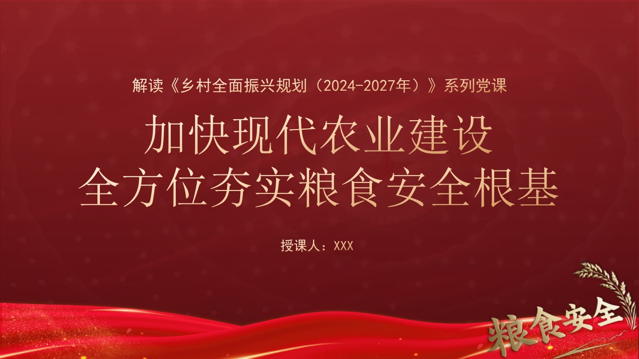 解读《乡村全面振兴规划(2024-2027年)》系列党课加快现代农业建设全方位夯实粮食安全根基授课人:XXX粮食安全前言PREFACE■实施乡村振兴战略是以重要领导为核心的党中央着眼党和国家事业全局作出的重大决策,是新时代新征程“三农”工作的总抓手。■中共中央、国务院印发的《乡村全面振兴规划(2024一2027年)》(以下简称《规划》)明确提出,到2027年要实现“国家粮食安全根基更加稳固,农业综合生产能力稳步提升,确保中国人的饭碗牢牢端在自己手中”的重要目标,并将“加快现代农业建设,全方位夯实粮食安全根基”列为九项重点任务之一。食安全