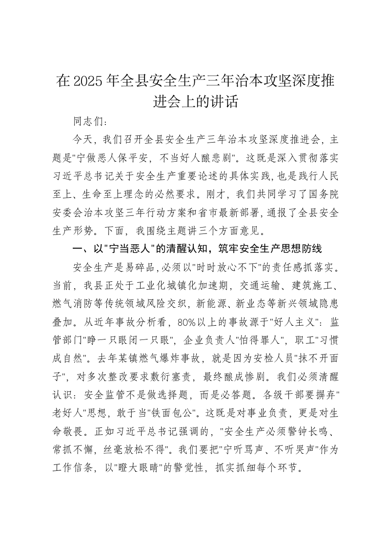 在2025年全县安全生产三年治本攻坚深度推进会上的讲话同志们:今天,我们召开全县安全生产三年治本攻坚深度推进会,主题是"宁做恶人保平安,不当好人酿悲剧"。这既是深入贯彻落实习近平总书记关于安全生产重要论述的具体实践,也是践行人民至上、生命至上理念的必然要求。刚才,我们共同学习了国务院安委会治本攻坚三年行动方案和省市最新部署,通报了全县安全生产形势。下面,我围绕主题讲三个方面意见。一、以"宁当恶人"的清醒认知,筑牢安全生产思想防线安全生产是易碎品,必须以"时时放心不下"的责任感抓落实。当前,我县正处于工业化城镇化加速期,交通运输、建筑施工、燃气消防等传统领域风险交织,新能源、新业态等新兴领域隐患叠加。从近年事故分析看,80%以上的事故源于"好人主义":监管部门"睁一只眼闭一只眼”,企业负责人"怕得罪人”,职工"习惯成自然”。去年某镇燃气爆炸事故,就是因为安检人员"抹不开面子”,对多次整改要求敷衍塞责,最终酿成惨剧。我们必须清醒认识:安全监管不是做选择题,而是必答题。各级干部要摒弃”老好人”思想,敢于当"铁面包公”。这既是对事业负责,更是对生命敬畏。正如习近平总书记强调的,"安全生产必须警钟长鸣、常抓不懈,丝毫放松不得”。我们要把”宁听骂声、不听哭声"作为工作信条,以"瞪大眼睛"的警觉性,抓实抓细每个环节。二、以"刮骨疗毒"的攻坚举措,构建标本兼治责任体系(一)隐患整治要"下狠手"。深入推进"全覆盖、零容忍、严执法、重实效"十二字方针,建立"企业自查-部门核查-专家协查-政府督查"四级排查机制。针对燃气安全,实施"瓶改管、瓶改电”百日攻坚,今年6月底前完成所有经营性场所改造。建筑工地推行"红黄绿"三色预警,对连续两次黄牌警告的企业顶格处罚。危险化学品领域建立"一企一策"电子档案,运用物联网技术实现24小时动态监测。(二)责任落实要"出硬招”。严格落实"党政同责、一岗双责、齐抓共管、失职追责”,建立"责任清单+履职档案"双轨机制。行业部门实行"管行业必须管安全"负面清单管理,对监管缺位的启动"一案双查”。企业落实"晨会+班前十分钟"制度,推行安全生产"积分制”,将安全绩效与员工薪酬、晋升挂钩。建立”隐患随手拍"全民监督平台,今年实现行政村全覆盖。(三)基础建设要"打实桩”。推进"智慧安监"工程,整合应急、交通、住建等部门数据,构建"风险监测-智能预警-联动处置"一体化平台。组建县级综合应急救援大队,各乡镇建立30人以上专职救援队,重点企业配备"微型消防站”。实施"安全明白人"培育计划,三年内实现企业负责人、安全员、特种作业人员培训全覆盖,开展"”安全文化进万家"活动,培育100个安全示范社区。三、以"动真碰硬"的严实作风,确保攻坚行动落地见效(一)强化政治担当,拧紧"责任链"。各级党政”一把手"要履行"第一责任人“职责,每月带队检查安全生产。建立"县领导包