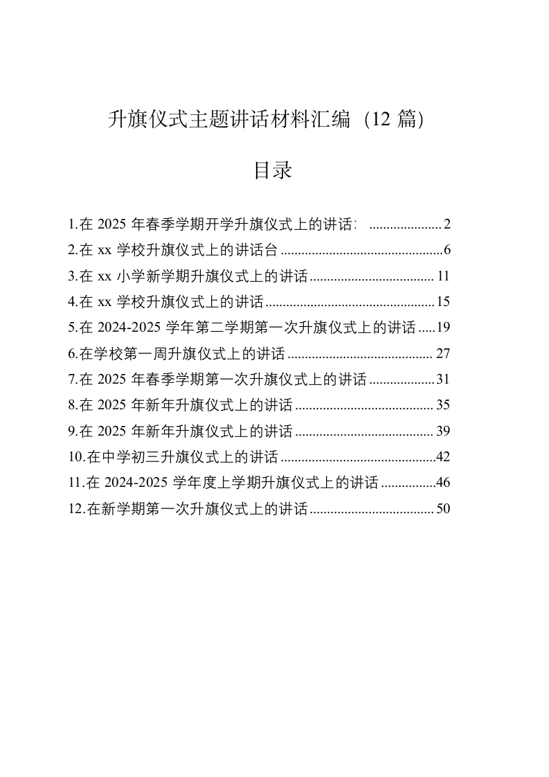 升旗仪式主题讲话材料汇编(12篇)目录1.在2025年春季学期开学升旗仪式上的讲话:2.在Xx学校升旗仪式上的讲话台…3.在Xx小学新学期升旗仪式上的讲话.…4.在xx学校升旗仪式上的讲话…5.在2024-2025学年第二学期第一次升旗仪式上的讲话..196.在学校第一周升旗仪式上的讲话7.在2025年春季学期第一次升旗仪式上的讲话…318.在2025年新年升旗仪式上的讲话.….359.在2025年新年升旗仪式上的讲话.3910.在中学初三升旗仪式上的讲话…11.在2024-2025学年度上学期升旗仪式上的讲话4612.在新学期第一次升旗仪式上的讲话在2025年春季学期开学升旗仪式上的讲话:尊敬的各位老师、亲爱的同学们:大家上午好!告别了祥和愉快的新春佳节,结束了短暂的寒假,我们又迎来了新学期的开学升旗仪式,在这万象更新的美好时刻,我谨代表学校理事会、校务会,向每一位辛勤耕耘的教职员工,向每一位朝气蓬勃的同学,致以最真挚的问候和最美好的祝愿!愿大家在新的一年里所愿即所成,多喜乐,长安宁!回首过往的2024年,我们携手并肩,砥砺前行,收获了无数的荣耀与感动。学校教学质量明显提高,本科上线率从XxXx等奖、Xx县教育系统安全工作先进集体、铜仁市五四红旗团委、县先进基层党组织、县教研工作先进集体等荣誉称号;县教育局对学校工作的年检首获优秀等第。教职工获县级以上各类荣誉表彰奖励Xx人次,各级教研教改及学生竞赛指导奖励Xx人次,其中有x名教师荣获县级优质课竞赛二等奖,x名教师荣获市级优质课竞赛三等奖,ⅹ人荣获县级中青年教师教学技能大赛二等奖,x人荣获县级优秀教研个人奖;有Xx位老师获论文发表一等奖;有ⅹ名教师参加省教师专业技术职务评审获中学一级教师资格。有Xxx位同学考上了本科院校,Xxx位同学被分类招生大专院校录取。