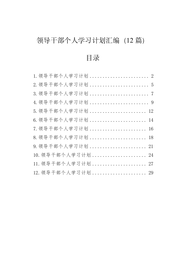 领导干部个人学习计划汇编(12篇)目录1.领导干部个人学习计划22.领导干部个人学习计划53.领导干部个人学习计划74.领导干部个人学习计划95.领导干部个人学习计划...126.领导干部个人学习计划147.领导干部个人学习计划...168.领导干部个人学习计划189.领导干部个人学习计划2110.领导干部个人学习计划...2411.领导千部个人学习计划...2712.领导干部个人学习计划...29领导干部个人学习计划一、领导重视、提前谋划开完区里的创建学习型机关的动员会以后,街道党委立刻行动召开街道的动员会,成立了街道创建学习型机关的领导小组,任组长,同时按照区委创建学习型机关方案的要求,制订了切实可行的《街道创建学习型机关实施方案》。街道领导班子深刻认识到学习型机关对“和谐街道”建设的重要性,通过多次召开专题会议,对机关干部的学习活动提出明确要求,建立了“主要领导负总责,分管领导亲自抓,班子人员配合抓,机关党支部具体抓”的领导机制和工作机制,确保人员到位、责任到位、工作到位。街道班子特别注重学习理念的提升,坚持把学习摆到重要位置,与业务工作一同布置,一同检查,一同落实。要求机关党员干部要人人学习,时时学习,处处学习。党员领导干部坚持带头参加各类学习,带头参加实践活动,发挥表率和示范引领作用。在开展工作中我们重点做到了以下几点:领导示范引领。自开展此项活动以来,街道党委领导班子在自觉学习的基础上,结合分管工作,带头为机关干部、社区干部上党课;党政主要领导坚持在每周五政治学习课上结合当前重点工作和干部群众的思想热点作中心发言,班子其他领导轮流主持学习课程,结合分管工作做重点阐述,对促进干部加强学习,提高分析问题和解决问题的能力,起到了很好的引领作用,为更好