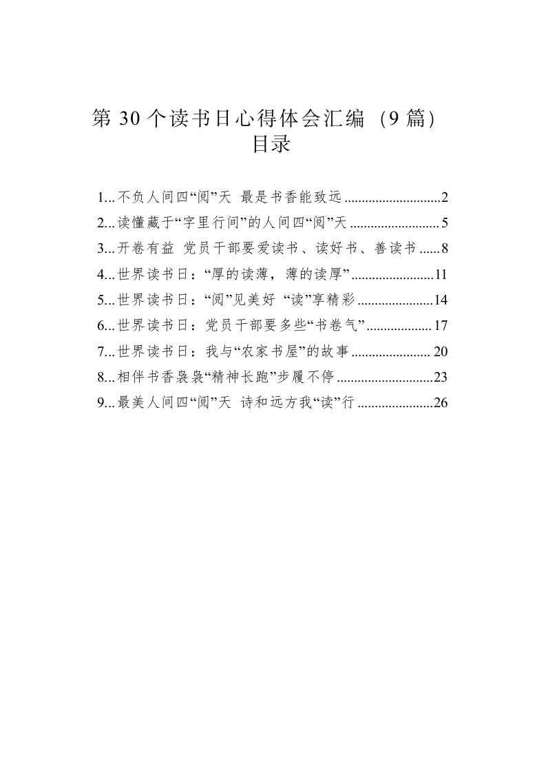 第30个读书日心得体会汇编(9篇)目录1..不负人间四“阅”天最是书香能致远.…22读懂藏于“字里行间”的人间四“阅”天.53.开卷有益党员千部要爱读书、读好书、善读书.84.世界读书日:“厚的读薄,薄的读厚”115..世界读书日:“阅”见美好“读”享精彩…146世界读书日:党员干部要多些“书卷气”177.世界读书日:我与“农家书屋”的故事.208相伴书香袅袅“精神长跑”步履不停.239.最美人间四“阅”天诗和远方我“读”行26不负人间四“阅”天最是书香能致远书香氤氲处,自有桃花源。四月天气清爽和暖,推窗可见自然之美,开卷自拥书香满怀。第30个世界读书日将要到来,无论是与风作伴,在阳光下慢慢读上几页,还是一盏明灯映照眼眸,在案牍上写下读书笔记,广大党员干部当不负人间四“阅”天,真正把爱读书、读好书、善读书作为生活习惯,真正让知识沁润心田,让知识成为助推自我进步和成长的最佳燃料,达到最是书香能致远的效果。洽博多闻,永葆生命不止、学习不停的勤学之心。“吾生也有涯,而知也无涯。”书籍是人类进步的阶梯,无论是诗词歌赋诉说源远流长的历史文化,还是古籍古书写进世界浩瀚的万千色彩,无论是关于哲学、经济、数学等的深入探讨,还是着眼于人的内心、情绪而写下的动人诗行,在书海里漫步,我们既能增长知识、获取信息,也能开拓视野、提升能力,更能陶冶情操、涵养境界。读书既是放松,也是充电,广大党员干部要主动挤一挤工作和生活里的碎片时间,在晨间和午后、黄昏或傍晚,捧起一卷好久未读、一直想读的书,相伴书香袅袅,为人生打下坚实的思想根基,真正在广泛阅读中涵养“腹有诗书气自华”的境界。术业专攻,永葆精益求精、格物致知的钻研之心。“业精于勤,荒于嬉;行成于思,毁于随。”在读书的过程中辩证掌握“博”与“专”、“厚”与“薄”的关系,既是一种能力的体现,也是确