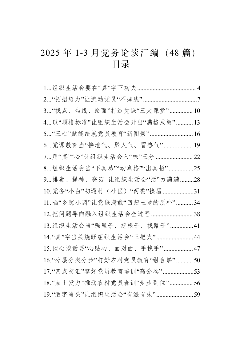 2025年1-3月党务论谈汇编(48篇)目录1.组织生活会要在“真”字下功夫42..“招招给力”让流动党员“不掉线”3..“找点、勾线、绘面”打造党课“三大课堂”104..以“顶格标准”让组织生活会开出“满格成效”.135..“三心”赋能绘就党员教育“新图景”6.…党课教育当“接地气、聚人气、冒热气”…197用“真“心”让组织生活会入“味”三分8.组织生活会当“下真功%动真格%“出真招”259.排毒、提神、亮刃让组织生活会“活”力满满.…2810.党务“小白”初遇村(社区)“两委”换届3111.唱“乡愁小调”让党课满载“回归土地的质朴”3412.把问题导向融入组织生活会全过程..3813.组织生活会当“强里子、挖根子、找路子”4114.“真”字当头烧旺组织生活会“三把火”….4415.谈心谈话要“心贴心、面对面、手挽手”.4716.“分层分类分步”打好农村党员教育“组合拳”…5017.“四点交汇”答好党员教育培训“高分卷”…5318.“点上发力”推动农村党员春训“步步到位”…5619.“敢字当头”让组织生活会“有滋有味”…5920以“四抓四构建”赋能党员教育工作….6121.“高、精、全”勾勒党员春训“三维成长图”…6422.“入心、入情、入行”上好党员“新春第一课”.6723.“精“新“实”让党员春训“行稳致远”…24.耕好党员春训“三块田”…7425.深挖“红色富矿”打造党员教育“精神粮仓”…7726.巧用“微视角”聚焦党员教育“关键亮点”7927.“时时事事处处”让党课与党员“同频共振”.8228.答好“三问”让党员教育培训更“对味儿”8429.创新方式耕好党员教育管理“责任田”…8730.“点线面”勾画党员教育电视片“三维立体图”.8931.与“实”俱进让党课教育“走新”更“走心”.9232.巧用“摄影法”让党员教育出片、出圈、出彩…9733.围绕“三问”推动党课向“新”行.….9934.健全“三维体系”推动党员教育工作提质增效.10235.让主题党日“有滋有味”.10436.推动新兴领域党建更完善、更精细、更高效.10837.“敢”字当头开好民主生活会…38.“以小见大”让党员冬训“走深走新走实”.11339.紧扣“真、深、实”答好民主生活会“高分卷”.11640.“双向发力”推动流动党员管理“提质增效”.11941.民主生活会需下好“真”功夫…12242.精耕“党课田”让党员教育“润物无声”…124