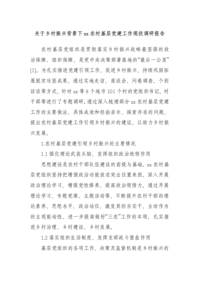 关于乡村振兴背景下x农村基层党建工作现状调研报告农村基层党组织是贯彻落实乡村振兴战略最坚强的政治保障、组织保障,是党中央决策部署落地的“最后一公里”[1]。为扎实推进党建引领工作,促进乡村振兴,持续巩固拓展脱贫攻坚成果,通过实地走访、座谈会、问卷调查、个别访谈等方式,针对x等8个地市101个村的党组织书记、村干部等进行了专题调研。通过深入梳理部分x农村基层党建工作的主要做法、具体成效和经验启示,探索存在的问题,提出农村基层党建工作引领乡村振兴的建议,以助力乡村振兴发展。1.农村基层党建引领乡村振兴的主要情况1.1强化理论武装头脑,发挥组织政治统领作用思想建设是农村干部队伍建设的前提与基础。燃农村基层党组织坚持把增强政治功能放在突出位置来抓,深入开展政治理论学习,增强党性修养,提高政治领悟力。通过开展理论学习、专题党课、主题活动等,不断提升农村干部的理论素养、思想水平、政治站位,激发其担当实干、主动作为的主观能动性,进一步提高做好“三农”工作的本领,扎实推进乡村治理、乡村建设、乡村发展。1.2落实组织生活制度,发挥支部战斗堡垒作用基层党组织的各项工作、决策及监督机制是乡村振兴的有力保障,是提高基层党组织凝聚力和战斗力的具体体现,要进一步建立健全基层党组织的各项工作机制[2]。近年来,x农村基层党组织加强对农村工作的全面领导,坚持将党支部的服务延伸到乡村经济、文化、人才、生态等方面,真正为民谋利,具体做好以下几个方面工作。1)落实民主集中制。严格执行“四议两公开”议事规则和决策程序,认真落实谈心谈话、双重组织生活会、基层党总支部工作联系点等制度。2)落实组织生活制度。制订党员教育培训计划,认真开展“三会一课”、主题党日活动等。同时,加强政治教育,落实个人述职述廉、村干部谈心谈话、民主评议党员等制度,始终把政治纪律和政治规矩挺在前面。3)坚决贯彻群众路线。扎实开展党员干部下基层、察民情、解民忧、暖民心实践活动,利用党群理事会、党员大会、村民代表座谈会、讲党课等多种形式,教育引领党员干部牢记全心全意为人民服务的根本宗旨。1.3加大内培外引力度,推动人才工作提质增效1)提升农村基层党组织干部的学历水平和综合素质。通过大力举办村党组织书记学历提升班、高素质农民培训班等,加强职业技能培训,提升其学历水平和素质。根据《新西部》期刊《2023年x燃乡村振兴发展报告》数据显示,2023年x面向超1.5万名村党组织书记、村委会主任,17万名村千部以及85万名建制村党员开展全员轮训。除此之外,开展
