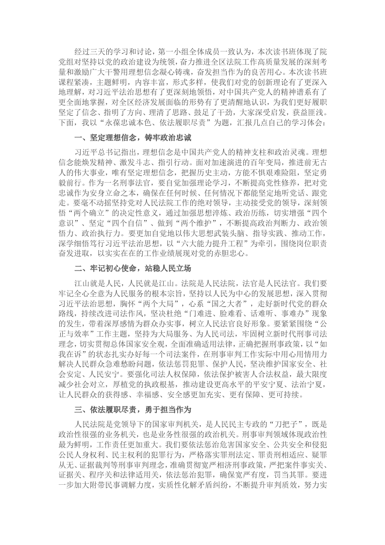 经过三天的学习和讨论,第一小组全体成员一致认为,本次读书班体现了院党组对坚持以党的政治建设为统领,奋力推进全区法院工作高质量发展的深刻考量和激励广大干警用理想信念凝心铸魂,奋发担当作为的良苦用心。本次读书班课程紧凑,主题鲜明,内容丰富,形式多样,使我们对党的创新理论有了更深入地理解,对习近平法治思想有了更深刻地领悟,对中国共产党人的精神谱系有了更全面地掌握,对全区经济发展面临的形势有了更清醒地认识,为我们更好履职坚定了信念、指明了方向、理清了思路、鼓足了干劲,大家深受启发,获益匪浅。下面,我以“永葆忠诚本色、依法履职尽责”为题,汇报几点自己的学习体会:一、坚定理想信念,铸牢政治忠诚习近平总书记指出,理想信念是中国共产党人的精神支柱和政治灵魂。理想信念能焕发精神、激发斗志、指引行动。面对加速演进的百年变局,推进前无古人的伟大事业,唯有坚定理想信念,把握历史主动,方能不惧艰难险阻,坚定勇毅前行。作为一名刑事法官,要自觉加强理论学习,不断提高党性修养,把对党忠诚作为安身立命之本,确保在任何时候、任何情况下都能坚定地听党话、跟党走。要毫不动摇坚持党对人民法院工作的绝对领导,主动接受党的领导,深刻领悟“两个确立”的决定性意义,通过加强思想淬炼、政治历练,切实增强“四个意识”、坚定“四个自信”、做到“两个维护”,不断提高政治判断力、政治领悟力、政治执行力。要更加自觉地以伟大思想武装头脑、指导实践、推动工作,深学细悟笃行习近平法治思想,以“六大能力提升工程”为牵引,围绕岗位职责奋发进取,以实实在在的工作业绩展现对党的赤胆忠心。二、牢记初心使命,站稳人民立场江山就是人民,人民就是江山。法院是人民法院,法官是人民法官。我们要牢记全心全意为人民服务的根本宗旨,坚持以人民为中心的发展思想,深入贯彻习近平法治思想,胸怀“两个大局”,心系“国之大者”,走好新时代党的群众路线,持续改进司法作风,坚决杜绝“门难进、脸难看、话难听、事难办”现象的发生,带着深厚感情为群众办实事,树立人民法官良好形象。要紧紧围绕“公正与效率”工作主题,坚持为大局服务、为人民司法,牢固树立新时代刑事司法理念,切实贯彻总体国家安全观,全面准确适用法律,正确把握刑事政策,以“如我在诉”的状态扎实办好每一个司法案件,在刑事审判工作实际中用心用情用力解决人民群众急难愁盼问题,依法惩罚犯罪、保护人民,坚决维护国家安全、社会安定、人民安宁。要强化司法人权保障,依法保护被害人合法权益,最大限度减少社会对立,厚植党的执政根基,推动建设更高水平的平安宁夏、法治宁夏,让人民群众的获得感、幸福感、安全感更加充实、更有保障、更可持续。三、依法履职尽责,勇于担当作为人民法院是党领导下的国家审判机关,是人民民主专政的“刀把子”,既是政治性很强的业务机关,也是业务性很强的政治机关。刑事审判领域体现政治性最为鲜明,工作责任更加重大。我们要依法惩治危害国家安全、公共安全和侵犯公民人身权利、民主权利的犯罪行为,严格落实罪刑法定、罪责刑相适应、疑罪从无、证据裁判等刑事审判理念,准确贯彻宽严相济刑事政策,严把案件事实关、证据关、程序关和法律适用关,依法惩治犯罪,确保宽严有度,罚当其罪。要进一步加大附带民事调解力度,实质性化解矛盾纠纷,不断提升审判质效,努力实现“三个效果”有机统一。要牢固树立治罪和治理并重的理念,积极参与社会治理,突出“抓前端、治未病”,通过加强裁判文书说理,强化法治宣传教育,提出司法建议等举措,推动各类违法犯罪向事前预防转型,努力实现“办理一案、治理一片”的效果。四、严守纪法规矩,永葆党性本色纪法规矩既是“紧箍咒”,也是“护身符”。我们要珍惜职业荣誉,恪守职业道德,时刻牢记纪法红线,始终严守廉洁底线,严格执行“三个规定”,不断净化自己的社交圈、娱乐圈、生活圈,坚决不办关系案、人情案、金钱案,不变质、不躺平、不摆烂,做到清正廉洁,公正司法,赢得群众信任。下一步,我要切实将读书班收获转化为推进工作的强大动力,按照院党组和x院长对做好刑事审判工作的新要求,立足本职,精耕细作,担当作为,为做好全年工作作出自己应有的贡献。