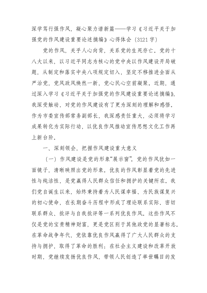 深学笃行强作风,凝心聚力谱新篇一学习《习近平关于加强党的作风建设重要论述摘编》心得体会(3121字)党的作风,关乎人心向背,关系党的生死存亡。党的十八大以来,以习近平同志为核心的党中央以作风建设开局破题,从制定和落实中央八项规定切入,坚定不移推进全面从严治党,党风政风焕然一新,党心民心空前凝聚。近期,通过深入学习《习近平关于加强党的作风建设重要论述摘编》,我深受触动,对党的作风建设有了更为深刻的理解和感悟。作为市委宣传部常务副部长,我深感责任重大,必须将学习成果转化为实际行动,以优良作风推动宣传思想文化工作再上新台阶。一、深刻领会,把握作风建设重大意义(一)作风建设是党的形象“展示窗”。党的作风犹如一面镜子,清晰映照出党的形象。优良的作风彰显着党的先进性与纯洁性,是党赢得人民群众信任和拥护的关键所在。我们党自诞生以来,始终秉持着为人民谋幸福、为民族谋复兴的初心使命,在长期奋斗历程中形成了理论联系实际、密切联系群众、批评与自我批评等一系列优良作风。这些作风不仅是党的宝贵精神财富,更是党区别于其他政党的显著标志。在革命战争年代,党依靠优良作风赢得了广大人民群众的支持与拥护,取得了革命的胜利;在社会主义建设和改革开放时期,党继续发扬优良作风,带领人民创造了举世瞩目的发展成就。在新时代,面对错综复杂的国际形势和艰巨繁重的国内改革发展稳定任务,更需要以良好的作风展示党的形象,凝聚起全国各族人民的力量,为实现中华民族伟大复兴的中国梦而努力奋斗。(二)作风建设是人心向背“晴雨表”。人心是最大的政治,得民心者得天下。党的作风直接关系到人心向背,关系到党的事业兴衰成败。习近平总书记强调:“党的作风正,人民的心气顺,党和人民就能同甘共苦。”在现实生活中,人民群众往往通过党员干部的作风来认识和评价党。如果党员干部作风优良,能够切实为人民群众办实事、解难题,人民群众就会真心拥护党;反之,如果党员干部作风不正,存在形式主义、官僚主义、享乐主义和奢靡之风等问题,就会严重损害党在人民群众心中的形象,削弱党的凝聚力和战斗力。因此,我们必须深刻认识到作风建设的极端重要性,始终坚持以人民为中心的发展思想,不断改进工作作风,密切联系群众,赢得人民群众的衷心拥护和支持。(三)作风建设是事业成败“定盘星”。作风建设不仅关乎党的形象和人心向背,更直接影响到党和国家事业的成败。良好的作风能够激发党员干部的工作热情和创造力,形成强大的凝聚力和战斗力,为事业发展提供有力保障。在新时代新征程上,我们面临着前所未有的机遇和挑战,要实现经济社会高质量发展,完成全面建设社会主义现代化国家的目标