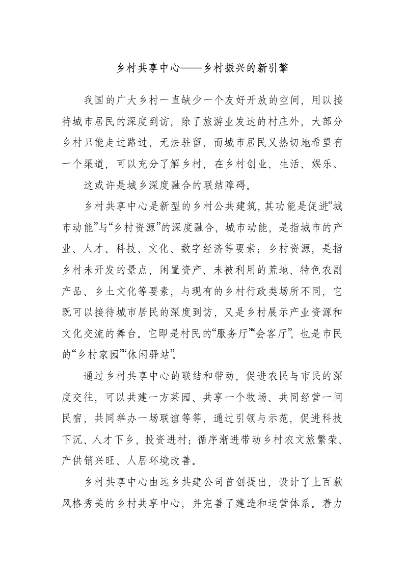 乡村共享中心一乡村振兴的新引擎我国的广大乡村一直缺少一个友好开放的空间,用以接待城市居民的深度到访,除了旅游业发达的村庄外,大部分乡村只能走过路过,无法驻留,而城市居民又热切地希望有一个渠道,可以充分了解乡村,在乡村创业、生活、娱乐。这或许是城乡深度融合的联结障碍。乡村共享中心是新型的乡村公共建筑,其功能是促进“城市动能”与“乡村资源”的深度融合,城市动能,是指城市的产业、人才、科技、文化、数字经济等要素;乡村资源,是指乡村未开发的景点,闲置资产、未被利用的荒地、特色农副产品、乡土文化等要素,与现有的乡村行政类场所不同,它既可以接待城市居民的深度到访,又是乡村展示产业资源和文化交流的舞台。它即是村民的“服务厅“会客厅”也是市民的“乡村家园“休闲驿站”通过乡村共享中心的联结和带动,促进农民与市民的深度交往,可以共建一方菜园、共享一个牧场、共同经营一间民宿,共同举办一场联谊等等,通过引领与示范,促进科技下沉、人才下乡,投资进村;循序渐进带动乡村农文旅繁荣、产供销兴旺、人居环境改善。乡村共享中心由远乡共建公司首创提出,设计了上百款风格秀美的乡村共享中心,并完善了建造和运营体系。着力构建“两大体系”+“六大场景”,两大体系是指“线下场所空间+线上运维平台”两大部分,场所空间为500-1500平米乡村共享中心建筑和室外广场,线上运维平台为“文旅农品分销+农旅培训+农技培训+美丽乡村共建+运维考核”等数字化系统。在此架构下,打造“建筑小而美、游客可留宿、特产可远销、产业可赋能、文娱有空间、乡建有智库”六大乡村场景,使乡村共享中心成为城乡要素自由流动的“新纽带”与“聚合器”乡村共享中心的三大特点(1)化解城乡融合的联结障碍,增强乡村发展活力(2)不搞“巨量投资换繁荣”倡导“循序渐进促振兴”(3)强调管护运维,真正成为“下蛋鸡”而非“摆设”建筑小而美,乡村风景线乡村共享中心是小而美的公共建筑,体现地域文化、民族风貌,目前,我们设计了上百款不同风格的乡村共享中心,各具特色,形态秀美。每个中心均设置了党群服务,村干办公、多功能会议室、阅览室、卫生所等乡村服务空间;也设置了乡土产品展销厅,终端供销社、电商孵化,小型冷链库,生鲜检疫室、远程培训室等产业互促空间;以及设置了小型乡村招待所,生态自主餐厅、村史展廊、小型体育场、停车场、乡村大舞台、放映场等文旅活动空间。乡村共享中心是美丽乡村的风景线,更是乡土文化的传承地,使之成为村民的骄傲,村干部的眷恋,城里人的向往。