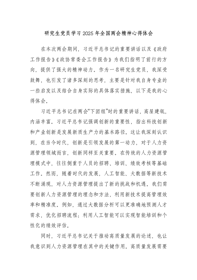 研究生党员学习2025年全国两会精神心得体会在本次两会期间,习近平总书记的重要讲话以及《政府工作报告》《政协常委会工作报告》为我们指明了前行的方向,提供了强大的精神动力。作为一名研究生党员,我深受鼓舞,也引发了诸多深刻的思考,主要是针对我自身专业的一些启发以及结合自身实际的具体落实措施,以下是我的心得体会。习近平总书记在两会“下团组”时的重要讲话,高屋建瓴,内涵丰富。习近平总书记强调创新的重要性,指出科技创新和产业创新是发展新质生产力的基本路径。这让我深刻认识到,在当今时代,创新是引领发展的第一动力,对于人力资源管理领域而言,创新同样至关重要。在传统的人力资源管理模式中,往往侧重于人员的招聘、培训、绩效考核等基础工作。然而,随着时代的发展,人工智能、大数据等新技术不断涌现,对人力资源管理提出了新的挑战和机遇。我们需要创新人力资源管理的理念和方法,利用新技术提高管理效率和精准度。例如,通过大数据分析可以更准确地预测人才需求,优化招聘流程;利用人工智能可以实现智能培训和个性化的绩效评估。同时,习近平总书记关于推动高质量发展的论述,也让我意识到人力资源管理在其中的关键作用。高质量发展需要高素质的人才支撑,在当前激烈的人才竞争环境下,如何为企业和社会吸引到优秀的人才,是我们需要深入思考的问题。我们要注重人才的综合素质和创新能力,打破传统的人才评价标准,学习多元化的人才评价体系。除了专业知识和技能,还要关注人才的品德、团队协作能力、创新思维等方面。只有这样,才能真正选拔出符合高质量发展需求的人才。《政府工作报告》中对教育、科技、人才的重视,与我所学的专业紧密相关。报告提出要深化教育综合改革,建设高质量教育体系,办好人民满意的教育。这让我联想到,人力资源管理中的培训与开发环节,其实就是一种企业内部的“教育”。我们要借鉴教育领域的先进理念和方法,为员工提供更有针对性、更高效的培训。例如,采用项目式学习、实践教学等方式,让员工在实际工作中提升能力。同时,报告强调要强化企业创新主体地位,这也要求我们要注重激发员工的创新意识和创新能力。可以通过建立创新激励机制,鼓励员工提出新的想法和建议,为企业的创新发展贡献力量。在《政协常委会工作报告》中,习近平总书记提到广泛凝聚人心、凝聚共识、凝聚智慧、凝聚力量,这对于管理团队建设具有重要的启示。一个团结、协作、富有凝聚力的团队,是企业取得成功的关键。我们要注重团队文化的建设,营造积极向上、相互支持的工作氛围。通过组织团队活动、开展沟通培训等方式,增强团队成员之间的信任和合作。同