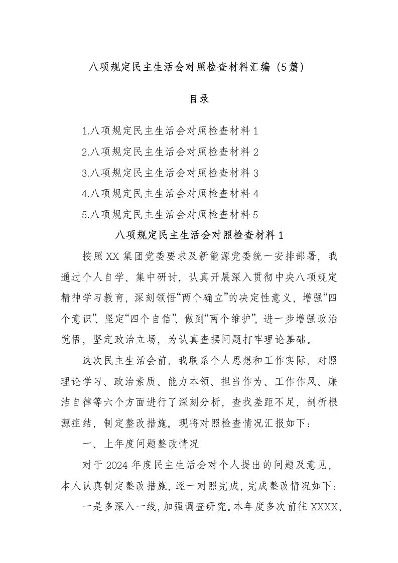 八项规定民主生活会对照检查材料汇编(5篇)目录1.八项规定民主生活会对照检查材料12.八项规定民主生活会对照检查材料23.八项规定民主生活会对照检查材料34.八项规定民主生活会对照检查材料45.八项规定民主生活会对照检查材料5八项规定民主生活会对照检查材料1按照X集团党委要求及新能源党委统一安排部署,我通过个人自学、集中研讨,认真开展深入贯彻中央八项规定精神学习教育,深刻领悟“两个确立”的决定性意义,增强“四个意识”坚定“四个自信”做到“两个维护”,进一步增强政治觉悟,坚定政治立场,为认真查摆问题打牢理论基础。这次民主生活会前,我联系个人思想和工作实际,对照理论学习、政治素质、能力本领、担当作为、工作作风、廉洁自律等六个方面进行了深刻分析,查找差距不足,剖析根源症结,制定整改措施。现将对照检查情况汇报如下:一、上年度问题整改情况对于2024年度民主生活会对个人提出的问题及意见,本人认真制定整改措施,逐一对照完成,完成整改情况如下:一是多深入一线,加强调查研究。本年度多次前往XXXX、江西XX、延安新能源生产现场进行实际调研,通过听取汇报,召开座谈会等形式,解决一线问题,与一线员工面对面沟通交流,了解员工工作或生活困难问题。通过参加员工座谈会,高温慰问等形式,加强与员工交流互动。二是加强员工业余文化建设。本年度,在公司统一协调下,江西X建成羽毛球、篮球、乒乓球活动场地并投入使用,为XX、延安新能源工会拨付费用购买健身器材,并组织员工开展了主题教育朗诵、乒乓球赛,员工户外拓展等活动,职工业余生活丰富多样,满意度明显提高。三是加快新技术的研发和应用。目前大尺寸产品产量占比稳定在95%以上,已成为公司主流产品。2.0mm薄型产品产量占比稳步提高,目前稳定在80%以上,1.6mm-1.8mm超薄产品成功下线。公司已具备双层镀生产能力,双层镀产品占约20%。四是加大人员培养,进行传帮带。今年以来,不断与骨干技术人员进行谈心谈话,技术交流,对于具有一定潜质管理技术人员,按照程序进行提拔重用,不断优化干部队伍、人才队伍建设,此项工作持续进行中。二、对照检查存在的问题(一)在理论学习方面。自己虽然按期参加党委理论中心组集体学习,认真参加了X电子组织的党的二十大网络培训班、X集团主题教育