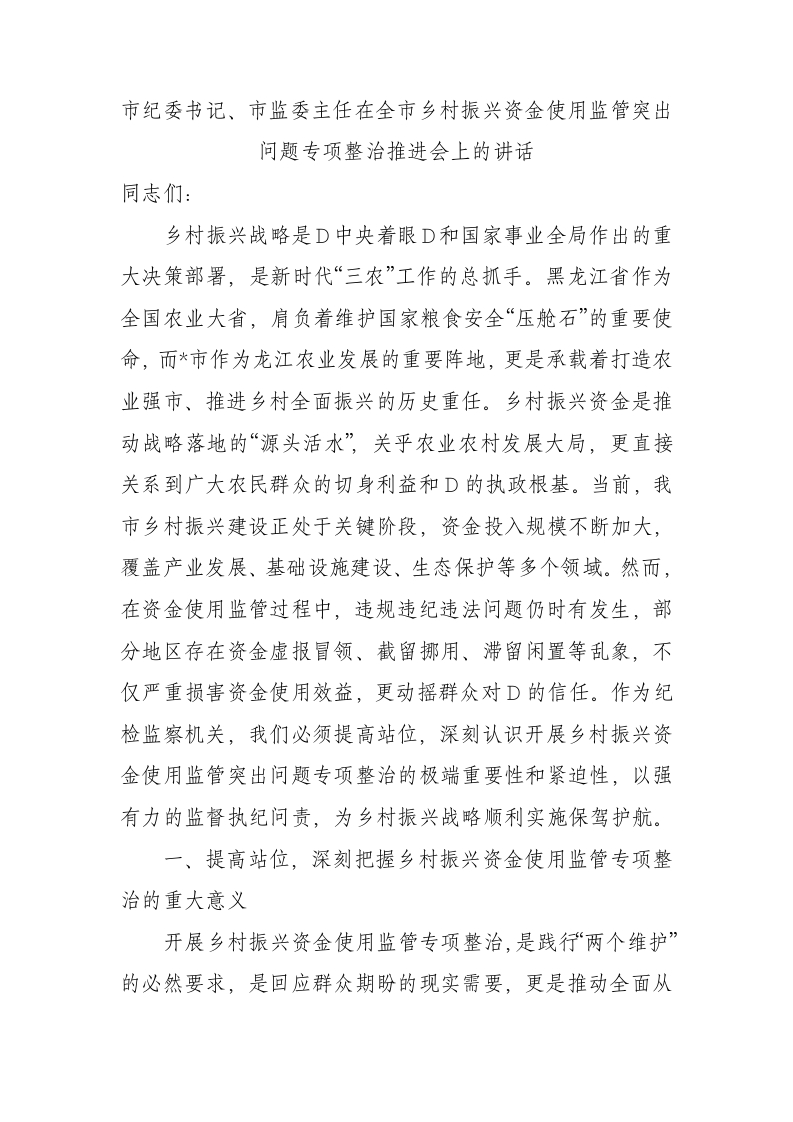 市纪委书记、市监委主任在全市乡村振兴资金使用监管突出问题专项整治推进会上的讲话同志们:乡村振兴战略是D中央着眼D和国家事业全局作出的重大决策部署,是新时代“三农”工作的总抓手。黑龙江省作为全国农业大省,肩负着维护国家粮食安全“压舱石”的重要使命,而*市作为龙江农业发展的重要阵地,更是承载着打造农业强市、推进乡村全面振兴的历史重任。乡村振兴资金是推动战略落地的“源头活水”,关乎农业农村发展大局,更直接关系到广大农民群众的切身利益和D的执政根基。当前,我市乡村振兴建设正处于关键阶段,资金投入规模不断加大,覆盖产业发展、基础设施建设、生态保护等多个领域。然而,在资金使用监管过程中,违规违纪违法问题仍时有发生,部分地区存在资金虚报冒领、截留挪用、滞留闲置等乱象,不仅严重损害资金使用效益,更动摇群众对D的信任。作为纪检监察机关,我们必须提高站位,深刻认识开展乡村振兴资金使用监管突出问题专项整治的极端重要性和紧迫性,以强有力的监督执纪问责,为乡村振兴战略顺利实施保驾护航。一、提高站位,深刻把握乡村振兴资金使用监管专项整治的重大意义开展乡村振兴资金使用监管专项整治,是践行“两个维护”的必然要求,是回应群众期盼的现实需要,更是推动全面从严治D向基层延伸的重要举措。我们要从高度出发,深刻领会此次专项整治的重大意义,切实增强责任感和使命感。一是从践行“两个维护”的高度看。D中央将乡村振兴战略作为实现中华民族伟大复兴的一项重大任务,多次强调要坚持农业农村优先发展,举全D全社会之力推动乡村振兴。乡村振兴资金是D中央支持农村发展的重要体现,确保这些资金安全、规范、高效使用,是我们贯彻落实D中央决策部署、践行“两个维护”的具体行动。只有以铁的纪律保障资金使用,才能让D的惠民政策真正落地见效,让广大农民群众感受到D中央的关怀和温暖。任何截留挪用、虚报冒领乡村振兴资金的行为,都是对D中央决策部署的阳奉阴违,必须坚决予以查处。二是从维护群众利益的根本立场看。乡村振兴资金承载着农民群众对美好生活的向往,每一分钱都凝聚着D和政府的关怀。近年来,随着乡村振兴战略的深入实施,大量资金投入到农村,用于改善农村生产生活条件、发展农村产业、提升公共服务水平。但如果这些资金被不法分子侵占、浪费,直接受损的就是农民群众的利益,必然会引发群众的不满和信任危机。我们开展专项整治,就是要以“零容忍”的态度,坚决查处侵害群众利益的腐败问题,让农民群众在乡村振兴中有更多的获得感、幸福感和安全感,不断巩固D执政的群众基础。