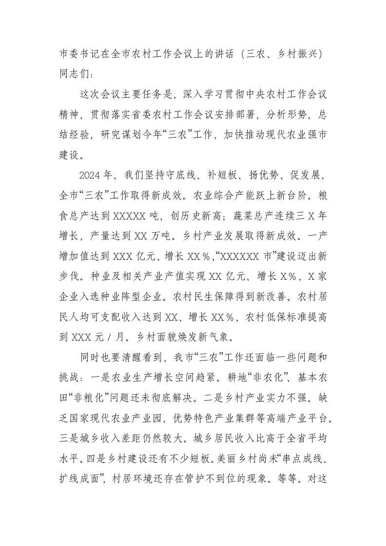 市委书记在全市农村工作会议上的讲话(三农、乡村振兴)同志们:这次会议主要任务是,深入学习贯彻中央农村工作会议精神,贯彻落实省委农村工作会议安排部署,分析形势,总结经验,研究谋划今年“三农”工作,加快推动现代农业强市建设。2024年,我们坚持守底线、补短板、扬优势、促发展,全市“三农”工作取得新成效。农业综合产能跃上新台阶。粮食总产达到XXXX吨,创历史新高;蔬菜总产连续三X年增长,产量达到X万吨。乡村产业发展取得新成效。一产增加值达到XX亿元、增长X%,“XXXXXX市”建设迈出新步伐。种业及相关产业产值实现X亿元、增长X%,X家企业入选种业阵型企业。农村民生保障得到新改善。农村居民人均可支配收入达到X、增长X%,农村低保标准提高到XX元/月。乡村面貌焕发新气象。同时也要清醒看到,我市“三农”工作还面临一些问题和挑战:一是农业生产增长空间趋紧。耕地“非农化”基本农田“非粮化”问题还未彻底解决。二是乡村产业实力不强。缺乏国家现代农业产业园、优势特色产业集群等高端产业平台。三是城乡收入差距仍然较大。城乡居民收入比高于全省平均水平。四是乡村建设还有不少短板。美丽乡村尚未“串点成线、扩线成面”,村居环境还存在管护不到位的现象。等等。对这些问题要采取有效措施,切实加以解决。在中央农村工作会议上,发表重要讲话,鲜明提出“强国必先强农、农强方能国强”的重大论断,深刻阐明了全面推进乡村振兴、加快建设农业强国的战略考量、总体要求、重点任务,为我们做好新时代“三农”工作提供了根本遵循和行动指南。省委召开农村工作会议,作出了XXX工作安排。下面,就贯彻落实中央农村工作会议和省委农村工作会议精神,做好今年全市“三农”工作,我讲三点意见。第一点,深刻把握全市“三农”工作的新形势新要求强调,全面建设社会主义现代化国家,最艰巨最繁重的任务仍然在农村。我们要深刻领会中央“重农强农”的战略部署,客观认识新时代我市“三农”工作的“时”与“势”,切实守好“三农”基本盘。一从工作重心看,D的二十大报告明确提出“加快建设农业强国”,首次将农业强国纳入社会主义现代化强国建设的宏观战略布局,这次中央农村工作会议又发出了务农重本的强烈信号。解决好“三农”问题已成为全D工作的重中之重,集全D全社会之力突破“三农”短板的氛围更加浓厚,政策、项目、资金等支持更加有力,这为我市全面推进乡村振兴、加快农业强市建设提供了重大机遇。一一从外部条件看,XXXX战略的持续赋能和“XXX”战略的深入实施,为我市包括“三农”在内的各项事业发展提