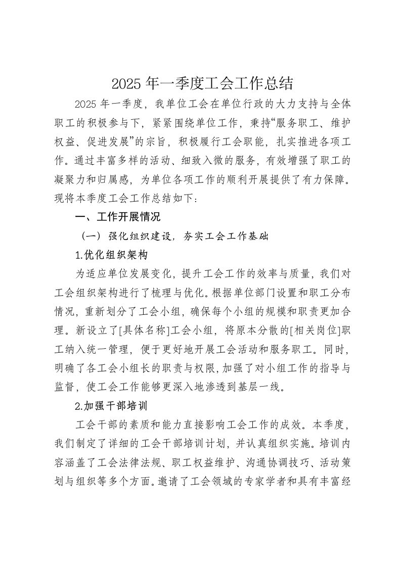 2025年一季度工会工作总结2025年一季度,我单位工会在单位行政的大力支持与全体职工的积极参与下,紧紧围绕单位工作,秉持“服务职工、维护权益、促进发展”的宗旨,积极履行工会职能,扎实推进各项工作。通过丰富多样的活动、细致入微的服务,有效增强了职工的凝聚力和归属感,为单位各项工作的顺利开展提供了有力保障。现将本季度工会工作总结如下:一、工作开展情况(一)强化组织建设,夯实工会工作基础1.优化组织架构为适应单位发展变化,提升工会工作的效率与质量,我们对工会组织架构进行了梳理与优化。根据单位部门设置和职工分布情况,重新划分了工会小组,确保每个小组的规模和职责更加合理。新设立了[具体名称]工会小组,将原本分散的[相关岗位]职工纳入统一管理,便于更好地开展工会活动和服务职工。同时,明确了各工会小组长的职责与权限,加强了对小组工作的指导与监督,使工会工作能够更深入地渗透到基层一线。2.加强干部培训工会干部的素质和能力直接影响工会工作的成效。本季度,我们制定了详细的工会干部培训计划,并认真组织实施。培训内容涵盖了工会法律法规、职工权益维护、沟通协调技巧、活动策划与组织等多个方面。邀请了工会领域的专家学者和具有丰富经验的同行进行授课,通过理论讲解、案例分析、小组讨论、实地考察等多种形式,让工会干部在轻松愉快的氛围中学习知识、提升能力。一季度共举办培训班X期,培训工会干部X人次。通过培训,工会干部的业务水平和工作积极性得到了显著提高,为更好地服务职工奠定了坚实的基础。3.完善制度建设制度是工会工作规范运行的保障。我们对现有的工会工作制度进行修订和完善,新制定了《工会经费使用管理办法》《职工困难帮扶实施细则》《工会活动组织与评估制度》等一系列规章制度,进一步明确了工会工作的流程、标准和要求,使各项工作有章可循、有据可依。同时,加强了对制度执行情况的监督检查,定期对制度的执行效果进行评估和反馈,及时发现问题并进行整改,确保制度的有效性和严肃性。(二)聚焦管理,维护职工合法权益1.顺利召开职工大会[具体日期],我们组织召开了[具体届次]职工大会。会议期间,来自各个岗位的X名职工齐聚一堂,认真履行职责,积极参与单位管理。大会审议并通过了单位行政工作报告、工会工作报告、财务工作报告等重要文件,对单位的发展规划、重大决策、涉及职工切身利益的规章制度等进行讨论和表决。职工们充分发扬主人翁精神,围绕单位的生产经营、管理创新、职工福利等方面提出了许多宝贵的意见和建议,共收集到提案X件。工会及时