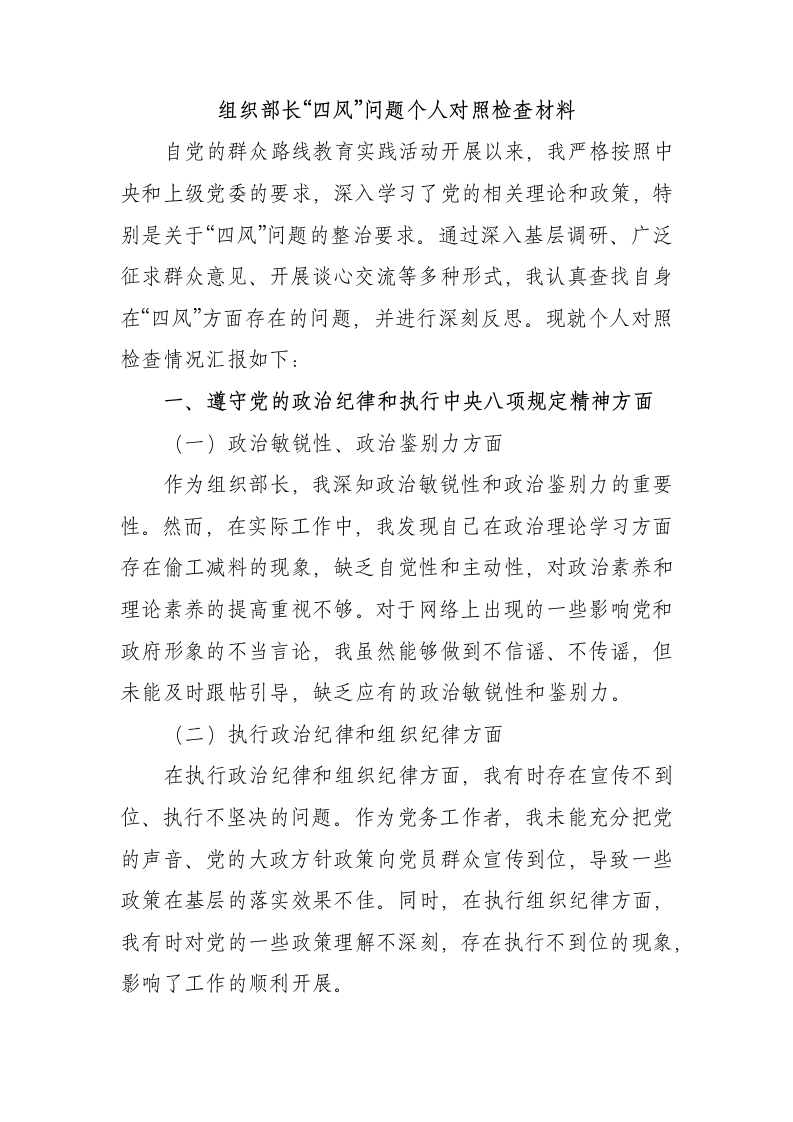 组织部长“四风”问题个人对照检查材料自党的群众路线教育实践活动开展以来,我严格按照中央和上级党委的要求,深入学习了党的相关理论和政策,特别是关于“四风”问题的整治要求。通过深入基层调研、广泛征求群众意见、开展谈心交流等多种形式,我认真查找自身在“四风”方面存在的问题,并进行深刻反思。现就个人对照检查情况汇报如下:一、遵守党的政治纪律和执行中央八项规定精神方面(一)政治敏锐性、政治鉴别力方面作为组织部长,我深知政治敏锐性和政治鉴别力的重要性。然而,在实际工作中,我发现自己在政治理论学习方面存在偷工减料的现象,缺乏自觉性和主动性,对政治素养和理论素养的提高重视不够。对于网络上出现的一些影响党和政府形象的不当言论,我虽然能够做到不信谣、不传谣,但未能及时跟帖引导,缺乏应有的政治敏锐性和鉴别力。(二)执行政治纪律和组织纪律方面在执行政治纪律和组织纪律方面,我有时存在宣传不到位、执行不坚决的问题。作为党务工作者,我未能充分把党的声音、党的大政方针政策向党员群众宣传到位,导致一些政策在基层的落实效果不佳。同时,在执行组织纪律方面,我有时对党的一些政策理解不深刻,存在执行不到位的现象,影响了工作的顺利开展。(三)执行民主集中制方面在执行民主集中制方面,我有时对一些较急的工作没有经过民主充分讨论和科学论证,只是和熟悉情况的同志简单商议就进行决策,导致民主发扬不充分,决策不科学。这不仅影响了工作的质量和效率,也损害了党组织的凝聚力和战斗力。(四)履行党风廉政建设“一岗双责”方面在履行党风廉政建设“一岗双责”方面,我存在自觉性、主动性不够的问题。在平时工作中,我对业务工作安排部署较多,但对党风廉政建设的重视程度不够,对干部廉政教育和管理不严,导致干部廉政风险防范意识不强,对一些苗头性问题发现不及时。这在一定程度上影响了党风廉政建设的深入推进。二、“四风”问题具体表现及原因分析(一)形式主义方面1.基层调研接地气不够在到基层调研时,我有时存在被调研单位事先定好路线、踩好点的情况,导致看亮点多、听问题少,对基层了解不全不深不透。有的工作浮在表面,只看好的,不问差的,看不到真实情况,听不到真实声音,总结不了好的做法。这种形式主义的做法严重影响了调研的质量和效果。2.文山会海精简不够尽管我自觉执行中央和省、市、县