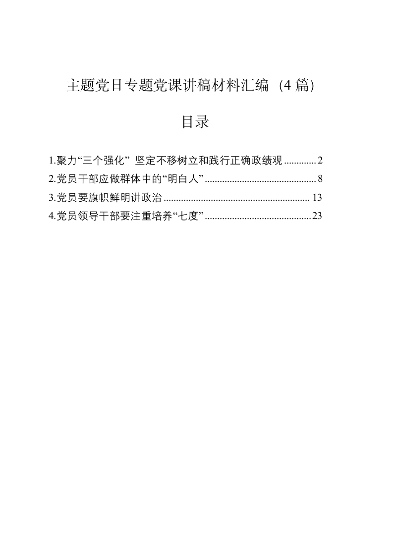 主题党日专题党课讲稿材料汇编(4篇)目录1.聚力“三个强化”坚定不移树立和践行正确政绩观22.党员干部应做群体中的“明白人”…3.党员要旗帜鲜明讲政治…4.党员领导干部要注重培养“七度”23聚力“三个强化”坚定不移树立和践行正确政绩观正确的政绩观,是为政之德、从政之道、施政之要。党的十八大以来,习近平总书记发表一系列重要讲话,作出一系列重要指示,深刻阐明了“政绩为谁而树、树什么样的政绩、靠什么树政绩”等重大问题。新征程上,作为党员领导干部要深入学习贯彻习近平总书记重要论述,树立和践行正确政绩观,努力创造经得起实践、人民、历史检验的实绩。今天,我以“聚力‘三个强化'坚定不移树立和践行正确政绩观”为题,从以下三个方面与大家共同学习交流。一、要警惕当前不良政绩观的三种表现(一)好大喜功,急功近利。第一,部分领导干部将“大”和“快”作为衡量工作成效的重要指标。个别国有企业不顾自身规模和能力,盲目承接一些超大规模的工程;个别地方政府未经充分论证,匆匆上马一些与群众现实生活脱节的项目;个别干部一味追求经济的粗放式增长,忽视政治、文化、社会、生态文明等领域的建设。第二,部分领导干部想在短期内出成绩,便将主要精力放在出“显绩”上。有的地方在经济发展中轻视生态保护,吃祖宗饭砸子孙碗;有的只看招商数据而不注重营商环境;有的国有企业盲目扩张,只重视企业规模的增长,不愿在科技攻关、培育核心竞争力方面下苦功夫。第三,部分领导干部在工作中追求