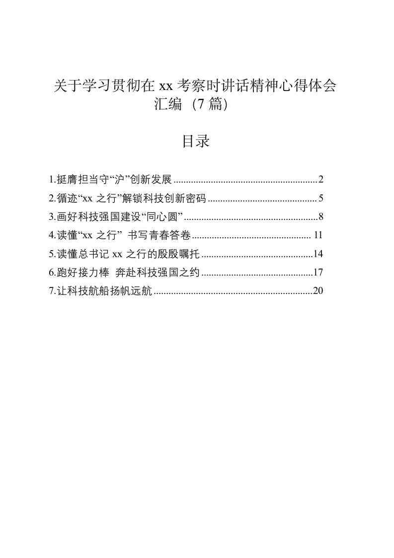 关于学习贯彻在x考察时讲话精神心得体会汇编(7篇)目录1.挺膺担当守“沪”创新发展.2.循迹“xx之行”解锁科技创新密码3.画好科技强国建设“同心圆”…84.读懂Xx之行”书写青春答卷…5.读懂总书记xx之行的殷殷嘱托.146.跑好接力棒奔赴科技强国之约…177.让科技航船扬帆远航挺膺担当守“沪”创新发展x月Xx日,习近平总书记在xx考察时强调,xx承担着建设国际科技创新中心的历史使命,要抢抓机遇,以服务国家战略为牵引,不断增强科技创新策源功能和高端产业引领功能,加快建成具有全球影响力的科技创新高地。广大年轻干部生逢伟大时代,当用心循迹xx之行”,在变化加速的年代里找准干事创业的制胜诀,以实际行动激发科技创新不竭动力,真正做到守“沪”创新发展,为进一步全面深化改革、推进中国式现代化注入强劲动能。练就真才实学,在奋进拼搏中成就创新华章。“立身百行,以学为基。”处在新时代的浪潮之中,各种新知识、新事物、新任务层出不穷,我们所遇到的陌生领域也越来越多,若仍旧停留在“吃老本”的阶段,自然在干事创业中会频频遇到无法解题答卷的困境,也会面临本领恐慌的焦虑情绪。广大年轻干部当用心练就真才实学,就要把学习当成一种责任、一份追求、一个习惯,既要深度聚焦科技创新前沿的各类资讯,主动选择到一些科技企业中去学习去蹲苗,用心去了解最先进的技术、最尖端的科技、最出彩的创造,不断把关乎科技创新的各类专业知识沉淀入心、铭刻在脑,积极投身于各类科技创新和应用试点等活动之中,始终在勇于探索实践中解锁成长密码,积极到实践中寻良方、谋新策、求突破,真正以奋进拼搏成就创新华章。培育远见卓识,在敢闯敢试中擦亮奇迹梦想。始终保持敢于