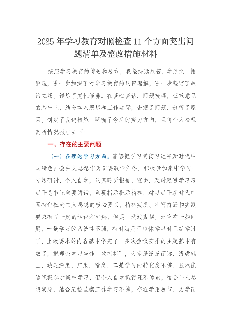 2025年学习教育对照检查11个方面突出问题清单及整改措施材料按照学习教育的部署和要求,我坚持读原著、学原文、悟原理,进一步加深了对学习教育的认识理解,进一步坚定了政治立场、锤炼了党性修养。在谈心谈话、问题梳理、征求意见的基础上,结合本人思想和工作实际,查摆了问题、剖析了原因,制定了改进措施,明确了今后的努力方向。现将个人检视剖析情况报告如下:一、存在的主要问题(一)在理论学习方面。能够把学习贯彻习近平新时代中国特色社会主义思想作为首要政治任务,积极参加集中学习、专题研讨、个人自学,认真聆听报告、宣讲,及时跟进学习习近平总书记重要讲话、重要指示批示精神,对习近平新时代中国特色社会主义思想的核心要义、精神实质、丰富内涵和实践要求有了一定的认识和理解。但是,通过查摆,还存在一些问题。一是学习的系统性不强。有时满足于集体学习时已经学过了、上级要求的内容基本学完了,多次会议安排的主题基本有数了,把理论学习当作“软指标”,大多是泛泛而读、浅尝辄止,缺乏深度、广度、精度。二是学习的转化度不够。虽然能够积极参加集中学习,但个人自学抓得还不够紧,结合个人思想实际、结合纪检监察工作学习不够,存在学用脱节、为学而学现象,将学习研讨成果转化为决策,推动解决突出问题、加快发展还不够到位。三是学习的自觉性不高。有时听专家讲座、看新闻、读报纸,只看标题,与纪检监察工作联系紧密的就多看看,需要时就找出来看看,缺乏静下心、下苦功、全面系统、持之以恒学习,没有真正把学习作为一种追求、一种爱好、一种健康的生活方式。(二)在思想政治方面。始终坚守绝对忠诚的政治品格,坚定不移贯彻落实习近平新时代中国特色社会主义思想,增强“四个意识”、坚定“四个自信”、做到“两个维护”,始终在思想上政治上行动上同以习近平同志为核心的党中央保持高度一致。但认真对照反思,还有一些差距和不足。一是政治敏锐性不强。有时从政治的角度观察、分析问题做得还不够,政治能力还需进一步提高,对于各类问题与当前政治形势的内在联系思考不深,认识事物不全面,发现问题不敏锐,不能及时把一些问题上升到政治高度去认识。二是斗争精神有所弱化。对社会上的一些不良现象虽然能够做到明辨是非,但有时怕得罪人,没有旗帜鲜明地进行抵制。从本质上讲,就是斗争精神不强,根子上还是政治站位不高、理想信念淡化。三是政治素养还需提升。有时政治站位不够高,自觉看齐的意识还不强,从政治上把大局、看问题、想事情的能力不足,还没有完全形成自觉,对照党章的要求和党的政治纪律,在有些方面做得不够或不好,缺少足够的警惕警觉,抓工作上也多是从具体