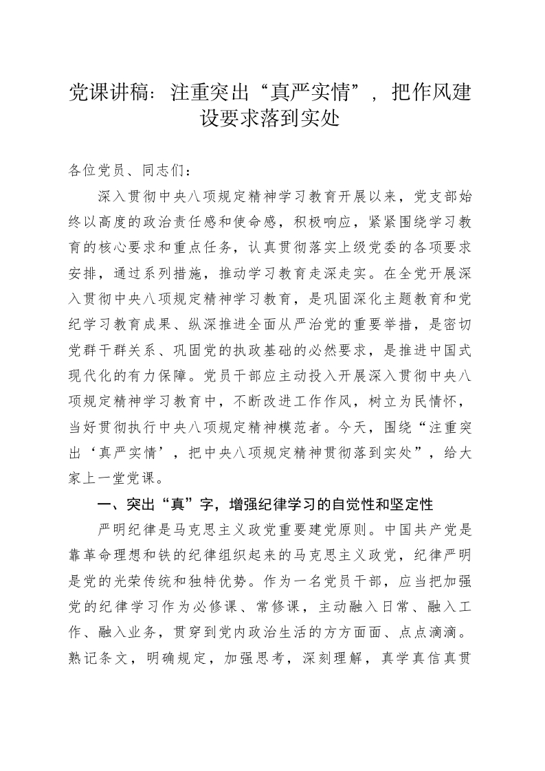 党课讲稿:注重突出“真严实情”,把作风建设要求落到实处各位党员、同志们:深入贯彻中央八项规定精神学习教育开展以来,党支部始终以高度的政治责任感和使命感,积极响应,紧紧围绕学习教育的核心要求和重点任务,认真贯彻落实上级党委的各项要求安排,通过系列措施,推动学习教育走深走实。在全党开展深入贯彻中央八项规定精神学习教育,是巩固深化主题教育和党纪学习教育成果、纵深推进全面从严治党的重要举措,是密切党群干群关系、巩固党的执政基础的必然要求,是推进中国式现代化的有力保障。党员干部应主动投入开展深入贯彻中央八项规定精神学习教育中,不断改进工作作风,树立为民情怀,当好贯彻执行中央八项规定精神模范者。今天,围绕“注重突出‘真严实情’,把中央八项规定精神贯彻落到实处”,给大家上一堂党课。一、突出“真”字,增强纪律学习的自觉性和坚定性严明纪律是马克思主义政党重要建党原则。中国共产党是靠革命理想和铁的纪律组织起来的马克思主义政党,纪律严明是党的光荣传统和独特优势。作为一名党员干部,应当把加强党的纪律学习作为必修课、常修课,主动融入日常、融入工作、融入业务,贯穿到党内政治生活的方方面面、点点滴滴。熟记条文,明确规定,加强思考,深刻理解,真学真信真贯彻,切实学懂弄通党的纪律规矩是什么,弄明白自己能干什么,不能干什么,做到内化于心、外化于行、重在执行。(一)常思“为何学”,明方向、筑根本。中央八项规定出台以来,党中央以鲜明态度与坚定行动,强调其为铁规矩、硬杠杠,必须一刻不松、寸步不让。党中央部署开展深入贯彻中央八项规定精神学习教育,再次向全党昭示:作风建设永远在路上。在新的历史条件下,一些党员干部对其精神实质理解不够深刻,存在形式主义、官僚主义等作风问题,这些问题严重损害了党在人民群众中的形象和威信。因此,开展深入贯彻中央八项规定精神学习教育,是解决当前作风问题的迫切需要,是巩固党的执政基础、永葆党的先进性和纯洁性的必然要求。只有通过学习教育,让广大党员干部深刻认识到中央八项规定的重要意义,才能以优良的作风赢得人民群众的信任和支持。(二)细思“学什么”,强党性、树新风。中央八项规定内涵丰富、要求明确,是新时代党的作风建设的行动指南。广大党员干部必须深入研读其核心要义,领悟其精神实质。要充分认识党的作风关乎党的生死存亡、人心向背、事业成败。精准领会中央八项规定及其实施细则精神的核心要义、实践要求,传承弘扬党的光荣传统与优良作风。注重理论联系实际,将中央八项规定精神实质与工作实际相结合,认真检查自身存在的问题和不足,切实加以整改,同时还要发挥模范带头作