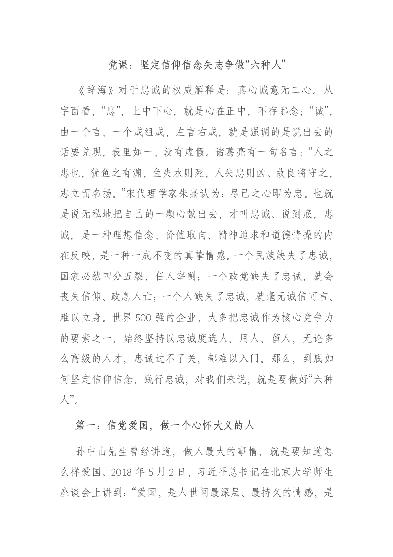 党课:坚定信仰信念矢志争做“六种人”《辞海》对于忠诚的权威解释是:真心诚意无二心。从字面看,“忠”,上中下心,就是心在正中,不存邪念;“诚”,由一个言、一个成组成,左言右成,就是强调的是说出去的话要兑现,表里如一、没有虚假。诸葛亮有一句名言:“人之忠也,犹鱼之有渊,鱼失水则死,人失忠则凶。故良将守之,志立而名扬。”宋代理学家朱熹认为:尽己之心即为忠。也就是说无私地把自己的一颗心献出去,才叫忠诚。说到底,忠诚,是一种理想信念、价值取向、精神追求和道德情操的内在反映,是一种一成不变的真挚情感。一个民族缺失了忠诚,国家必然四分五裂、任人宰割;一个政党缺失了忠诚,就会丧失信仰、政息人亡;一个人缺失了忠诚,就毫无诚信可言、难以立身。世界500强的企业,大多把忠诚作为核心竞争力的要素之一,始终坚持以忠诚度选人、用人、留人,无论多么高级的人才,忠诚过不了关,都难以入门。那么,到底如何坚定信仰信念,践行忠诚,对我们来说,就是要做好“六种人”。第一:信党爱国,做一个心怀大义的人孙中山先生曾经讲道,做人最大的事情,就是要知道怎么样爱国。2018年5月2日,习近平总书记在北京大学师生座谈会上讲到:“爱国,是人世间最深层、最持久的情感,是一个人立德之源、立功之本”。我们常讲,做人要有气节,要有人格。气节也好,人格也好,爱国是第一位的。今年,我们广泛开展教育活动,其中讲到公民的核心价值观,爱国就是第一位。在中华民族浩瀚的历史长河中,身怀忠勇大义的英雄典范不胜枚举,纵使时光再飞逝,年轮再流转,提起岳飞、方志敏、左权、赵一曼、夏明翰等民族英雄和革命先辈,我们依然为他们的忠诚而感动。西湖大学首任校长说:“我回到祖国的怀抱没有太多的理由,也不需要太多的理由,因为不论我身处何方,在外多久,都改变不了我骨子里流淌的是中国人的血,祖国赋予我们出国学习的机会,那么学成归来为祖国尽心尽力,我想这应该是每个华夏儿女应尽的责任,也是作为每个中国人的责任。”在这里,我们共同回顾旅创始人高敬亭将军的故事。1935年2月,在第三次组建红28军时,主力红军已战略转移,鄂豫皖根据地仅留下红军部队不足千人,且大部分都是伤病员,面对百倍于己的敌人,高敬亭喊出了“只要一心跟着共产党走,就一定能把红旗永远插在大别山”的口号,在与党中央失去联系的情况下坚持三年游击战争。毛主席都赞扬:“红28军,很了不起”。高敬亭将军这种至死不渝的革命精神,就是忠诚的最生动诠释。东西南北中,党政军民学,党是领导一切的。作为党员,我们讲忠诚,首要的就是忠于党、忠于祖国、忠于社会主义,就要听党话、跟党走,就要有浓烈的家国情怀,成为一个又红又专的人。
