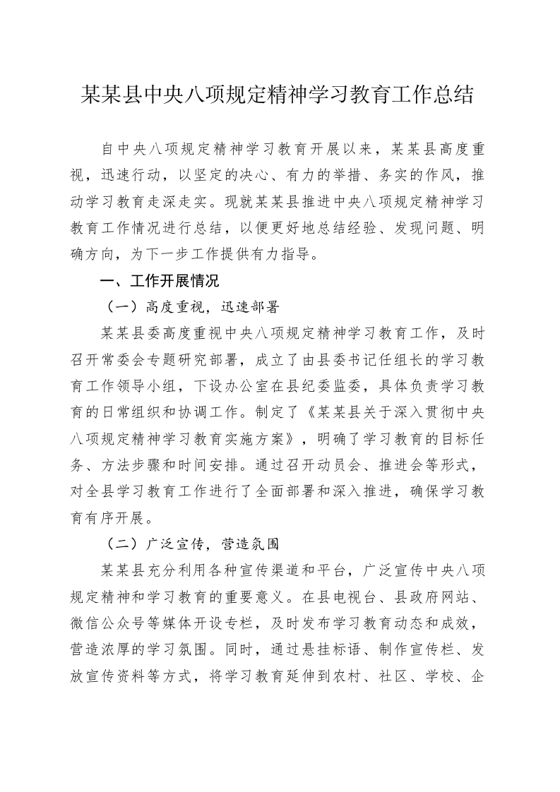 某某县中央八项规定精神学习教育工作总结自中央八项规定精神学习教育开展以来,某某县高度重视,迅速行动,以坚定的决心、有力的举措、务实的作风,推动学习教育走深走实。现就某某县推进中央八项规定精神学习教育工作情况进行总结,以便更好地总结经验、发现问题、明确方向,为下一步工作提供有力指导。一、工作开展情况(一)高度重视,迅速部署某某县委高度重视中央八项规定精神学习教育工作,及时召开常委会专题研究部署,成立了由县委书记任组长的学习教育工作领导小组,下设办公室在县纪委监委,具体负责学习教育的日常组织和协调工作。制定了《某某县关于深入贯彻中央八项规定精神学习教育实施方案》,明确了学习教育的目标任务、方法步骤和时间安排。通过召开动员会、推进会等形式,对全县学习教育工作进行了全面部署和深入推进,确保学习教育有序开展。(二)广泛宣传,营造氛围某某县充分利用各种宣传渠道和平台,广泛宣传中央八项规定精神和学习教育的重要意义。在县电视台、县政府网站、微信公众号等媒体开设专栏,及时发布学习教育动态和成效,营造浓厚的学习氛围。同时,通过悬挂标语、制作宣传栏、发放宣传资料等方式,将学习教育延伸到农村、社区、学校、企业等各个领域,让广大党员干部和群众深入了解中央八项规定精神,积极参与学习教育。(三)深入学习,提高认识某某县把深入学习作为学习教育的重要环节,通过集中学习、个人自学、专题研讨等多种形式,组织党员干部深入学习党的理论和路线方针政策,深入学习党规党纪和国家法律法规。特别是聚焦中央八项规定精神,组织党员干部原原本本学习党章党规,学习党中央和上级党委关于作风建设的决策部署,进一步明确日常言行的衡量标尺。1.县直单位做法:县直各单位纷纷响应号召,积极开展学习教育活动。如县纪委监委组织全体干部职工开展“学党纪、守规矩、作表率”主题教育活动,通过集中学习、交流研讨、撰写心得体会等方式,增强干部职工的纪律意识和规矩意识。县委组织部举办“党风廉政建设专题讲座”,邀请专家学者为全县党员干部讲解中央八项规定精神的深刻内涵和重要意义。县委宣传部利用宣传车、广播、电子显示屏等多种形式,广泛宣传中央八项规定精神和学习教育成果。2.各镇做法:各镇也结合实际,开展了丰富多彩的学习教育活动。如嵩阳街道组织党员干部参观廉政教育基地,通过观看警示教育片、参观廉政展览等方式,增强党员干部的廉洁自律意识。杨林镇开展“廉政文化进机关”活动,通过举办廉政书画展、廉政知识竞赛等形式,营造风清气正的机关氛围。牛
