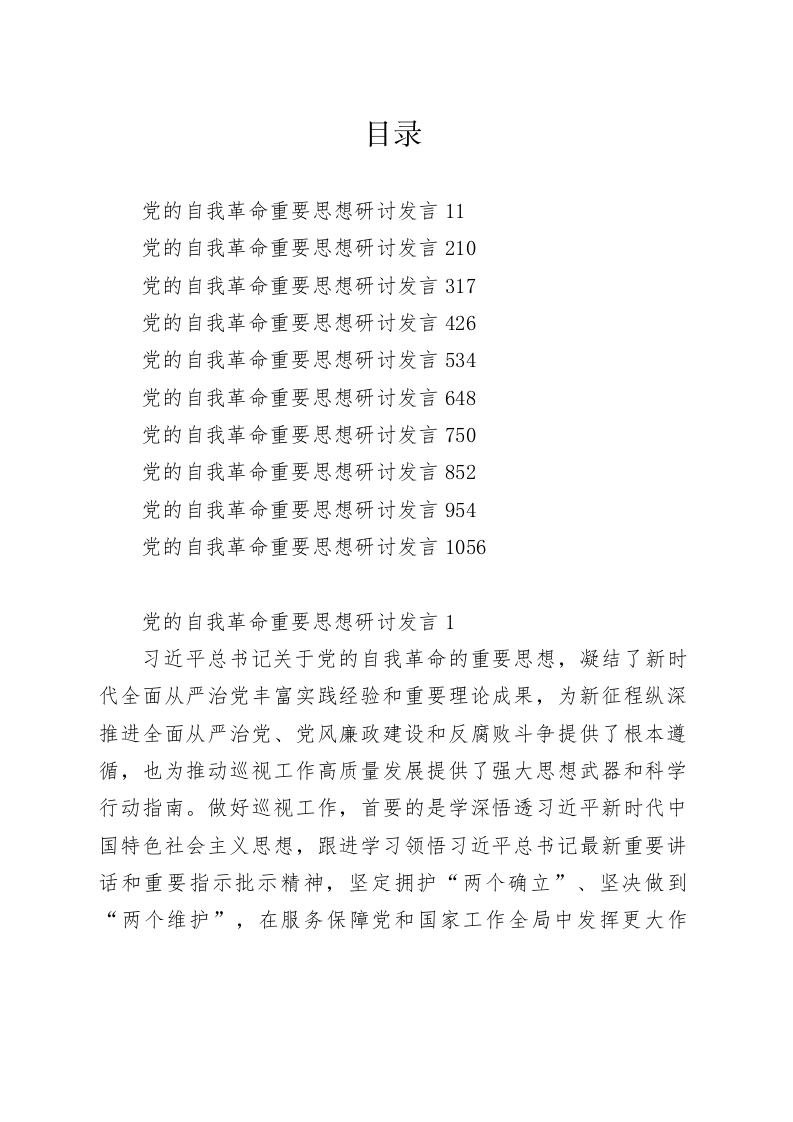 目录党的自我革命重要思想研讨发言11党的自我革命重要思想研讨发言210党的自我革命重要思想研讨发言317党的自我革命重要思想研讨发言426党的自我革命重要思想研讨发言534党的自我革命重要思想研讨发言648党的自我革命重要思想研讨发言750党的自我革命重要思想研讨发言852党的自我革命重要思想研讨发言954党的自我革命重要思想研讨发言1056党的自我革命重要思想研讨发言1习近平总书记关于党的自我革命的重要思想,凝结了新时代全面从严治党丰富实践经验和重要理论成果,为新征程纵深推进全面从严治党、党风廉政建设和反腐败斗争提供了根本遵循,也为推动巡视工作高质量发展提供了强大思想武器和科学行动指南。做好巡视工作,首要的是学深悟透习近平新时代中国特色社会主义思想,跟进学习领悟习近平总书记最新重要讲话和重要指示批示精神,坚定拥护“两个确立”、坚决做到“两个维护”,在服务保障党和国家工作全局中发挥更大作用。根据本次理论学习中心研讨安排,下面,由我围绕本次研讨主题,结合实际工作,与大家交流几点想法:一、鼓起“闯”的勇气,坚持问题导向,推进新征程巡视工作高质量发展党的十八大以来,习近平总书记对巡视工作高度重视,亲自谋划、亲自部署,听取巡视汇报、发表重要讲话,围绕巡视地位作用、巡视政治定位、巡视工作方针、巡视全覆盖、巡视整改、巡视规范化建设等提出一系列重要要求,不断引领推动巡视工作理论创新、实践创新、制度创新。必须坚持问题导向,是习近平新时代中国特色社会主义思想的立场观点方法之一。作为纪检监察干部,要全面系统学习领会,吃透精髓要义,掌握实践要求,坚持问题导向,着力破解纪检监察工作面临的各种问题,坚定不移推动纪检监察工作高质量发展。(一)以发现问题为生命线。巡视工作中坚持问题导向,就是要在坚持巡视监督政治定位的基础上发现问题和反映问题,要求其在工作中突出问题意识,聚焦问题所在,把握问题本质,同时运用好巡视工作成果提高解决问题的能力,实现以巡促改、以巡促建、以巡促治。巡视工作只有紧紧围绕“四个着力”方面的突出问题定坐标、明靶向,实现精准发力,才能确保巡视监督真正聚焦政治忠诚、政治安全、政治责任、政治立场和党内政治生活等方面有效开展。实践证明,聚焦“一个中心”、围绕“四个着力”开展巡视,是党的十八大以来党中