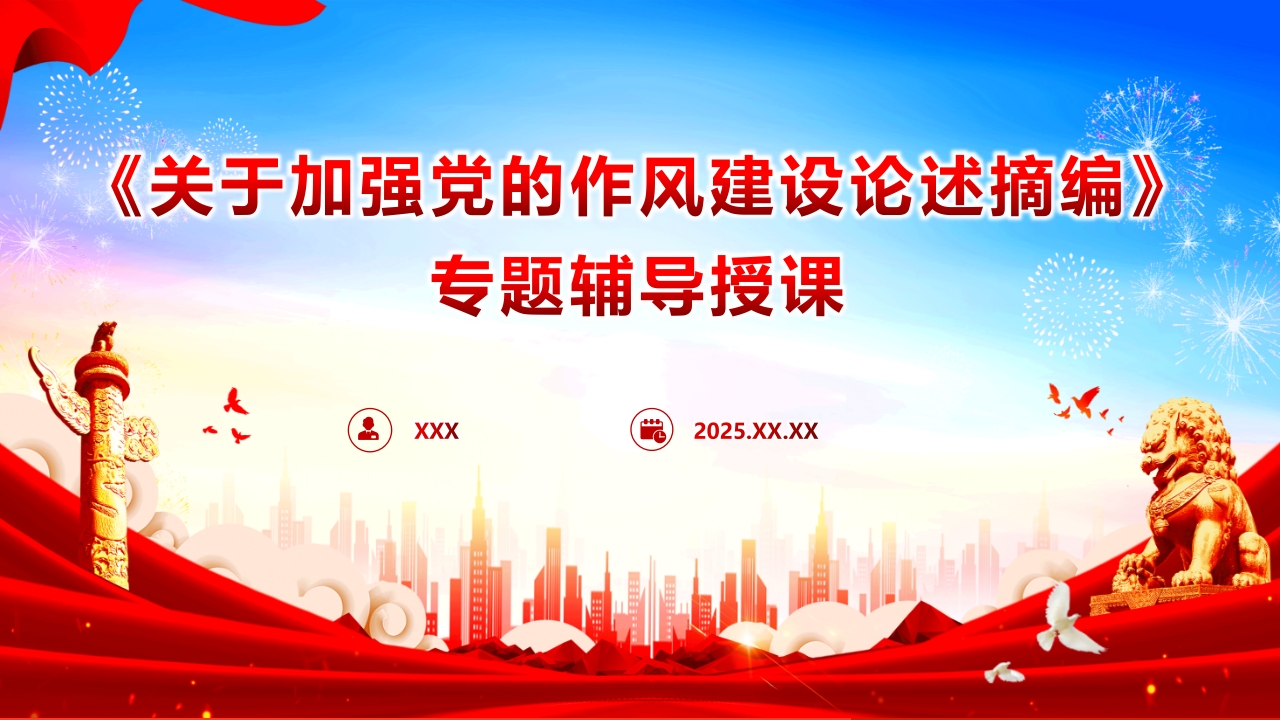 《关于加强党的作风建设论述摘编》专题辅导授课XXX2025.XX.XX前言党的作风就是党的形象,关系人心向背,关系党的生死存亡。习近平总书记强调,“我们党作为马克思主义执政党,不但要有强大的真理力量,而且要有强大的人格力量。真理力量集中体现为我们党的正确理论,人格力量集中体现为我们党的优良作风。”