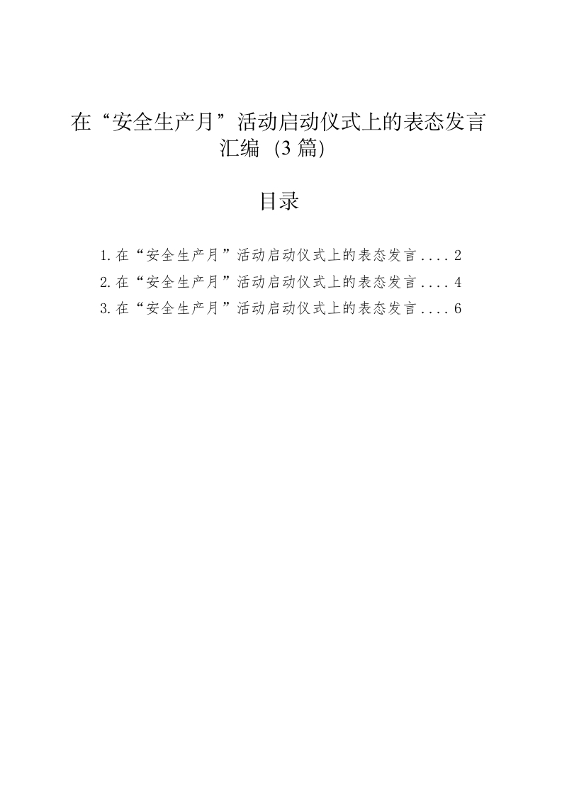 在“安全生产月”活动启动仪式上的表态发言汇编(3篇)目录1.在“安全生产月”活动启动仪式上的表态发言...22.在“安全生产月”活动启动仪式上的表态发言..·43.在“安全生产月”活动启动仪式上的表态发言..·6在“安全生产月”活动启动仪式上的表态发言尊敬的各位领导、同事们:大家好!我是X公司选煤一车间负责人X。安全生产是洗煤厂的生命线,是保障员工生命健康、企业稳定发展的根基。在2025年安全月来临之际,我们以“人人讲安全,个个会应急一一查找身边安全隐患”为主题,号召全体员工以高度的责任感和行动力,共同筑牢安全防线,让安全意识扎根于心,让应急能力践之于行,让隐患无处遁形!洗煤厂生产环境复杂,设备多、粉尘大、作业环节环环相扣,任何一处疏忽都可能引发严重后果。每一位员工都是安全生产的责任人,从班组长到一线操作工,都应做到:主动学习安全知识,掌握岗位操作规程、危险辨识方法、应急处置流程,参加安全培训与演练,做到“知风险、明职责、会操作”。通过班组会、安全交流会,分享自身或他人的安全案例,以真实故事警示风险,共同提升防范意识。应急能力是守护生命的最后一道屏障。洗煤厂常见风险包括机械伤害、粉尘爆炸、电气火灾、高空坠落等,必须做到“应急有方、处置有效”:我们将结合岗位特点,细化触电、火灾、设备故障等专项应急预案,明确救援流程、联络方式。定期检查和维护灭火器、急救箱、逃生器材等,确保关键时刻“拿得出、用得上”。
