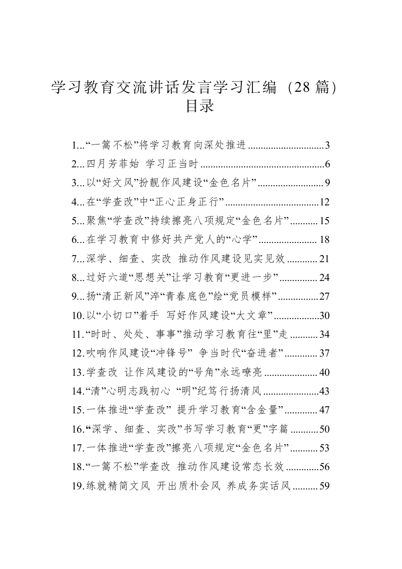 学习教育交流讲话发言学习汇编(28篇)目录1“一篙不松”将学习教育向深处推进.2.…四月芳菲始学习正当时…3.以“好文风”扮靓作风建设“金色名片”…4.在“学查改”中“正心正身正行”.125.聚焦“学查改”持续擦亮八项规定“金色名片”.156.在学习教育中修好共产党人的“心学”….187.深学、细查、实改推动作风建设见实见效218.过好六道“思想关”让学习教育“更进一步”249.扬“清正新风”淬“青春底色”绘“党员模样”…2710.以“小切口”着手写好作风建设“大文章”.…3011.“时时、处处、事事”推动学习教育往“里”走.3412.吹响作风建设“冲锋号”争当时代“奋进者”.3713.学查改让作风建设的“号角”永远嘹亮14.“清”心明志践初心“明”纪笃行扬清风.4315.一体推进“学查改”提升学习教育“含金量”…4716.“深学、细查、实改”书写学习教育“更”字篇.5017.一体推进“学查改”擦亮八项规定“金色名片”…5318.“一篙不松”学查改推动作风建设常态长效5619.练就精简文风开出质朴会风养成务实话风.5920.坚持开门教育确保学有质量查有力度改有成效..6221.在“学查改”中涵养好学律己笃行之风.6422.让作风建设成为“最动人的风景”23.学习教育常抓不懈政治自觉更高一筹.6924.扎实开展学习教育推动作风建设向“新”出发.7125.“走心、走深、走实”答好学习教育“高分卷”7526.一体推进“学查改”让作风建设“常”抓不懈..7827.持之以恒“学查改”答好作风建设“高分卷”8128.做实“深”字篇“一以贯之”推进学查改84