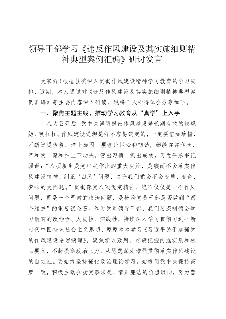 领导干部学习《违反作风建设及其实施细则精神典型案例汇编》研讨发言大家好!根据县委深入贯彻作风建设精神学习教育的学习安排,近期,本人通过对《违反作风建设及其实施细则精神典型案例汇编》等主要内容深入研读,现将个人心得体会分享如下。一、聚焦主题主线,推动学习教育从“真学”上入手十八大召开后,党中央鲜明提出作风建设是长期有效的铁规矩、硬杠杠。作风建设堤坝是好不容易筑起的,一定要倍加珍惜,不断巡堤检修、培土加固。要拿出恒心和韧劲,继续在常和长、严和实、深和细上下功夫,管出习惯、抓出成效。习近平总书记强调:“八项规定是党中央作出的重大决策,是锲而不舍落实作风建设精神、纠正‘四风’问题,关乎我们党会不会变质、变色、变味的大问题。”贯彻落实八项规定精神,绝不仅仅是一个作风问题,更是一个严肃的政治问题,是检验党员干部是否做到“两个维护”的重要试金石。作为党员领导干部,我们要深刻领会学习教育的政治性、人民性、实践性,持续深入学习贯彻习近平新时代中国特色社会主义思想,原原本本学习《习近平关于加强党的作风建设论述摘编》,聚焦学以致用,准确把握内涵实质和核心要义,不断提高政治三力,从思想深处增强贯彻落实作风建设的自觉性。要始终坚持强化政治理论学习,始终同党中央保持高度一致,积极主动弘扬实事求是、清正廉洁的价值取向,努力营造XX良好的政治生态。要坚持学思用贯通、知信行统一,把党的作风建设重要思想转化为坚定理想、锤炼党性和指导实践、推动工作的强大力量,推动XX工作高质量发展。二、聚焦突出问题,推动学习教育从“真查”上入手实践充分证明,八项规定不是简单的“不准”和“禁止”,而是关系党的形象、关系人心向背、关系党的生死存亡的政治规矩和政治要求,是党自我净化、自我完善、自我革新、自我提高的重要制度保障。XX部门作为党的政治机关,必须以高度的政治责任感和使命感,切实扛起学习教育的主体责任。明确责任分工,细化任务清单,确保学习教育与XX业务同部署、同推进、同落实,形成责任明确、执行高效的闭环管理体系。特别是从当前我县实际情况来看,党员干部队伍建设还存在一些短板弱项,比如,个别村对学习教育认识不够,动员大会召开之后,对今后的学习工作没有明确的安排和计划;个别干部长期忙私活,没有用心思做工作,严重影响其他干部积极性;部分单位班子成员与一般干职工之间的沟通与交流比较少;有些干部经常不下乡,不了解群众,不到群众中去做工作,用电话指挥或叫下属或叫村干部去解决矛盾纠纷,等等。对于这些问题,我们将坚持以正风肃纪反腐为重要抓手,以严的基调重拳整治为请托办事违规组局吃喝、领导干部参与赌博、违规经商办企业等突出问题,由“风”的线头扯出“腐”的线团,坚决清除披着人情往来外衣的腐败问题。作为县领导,我本人也将带头,强化主体责任和监督责任,推进全面从严治党向纵深发展方面。认真开展政治家访、谈心谈