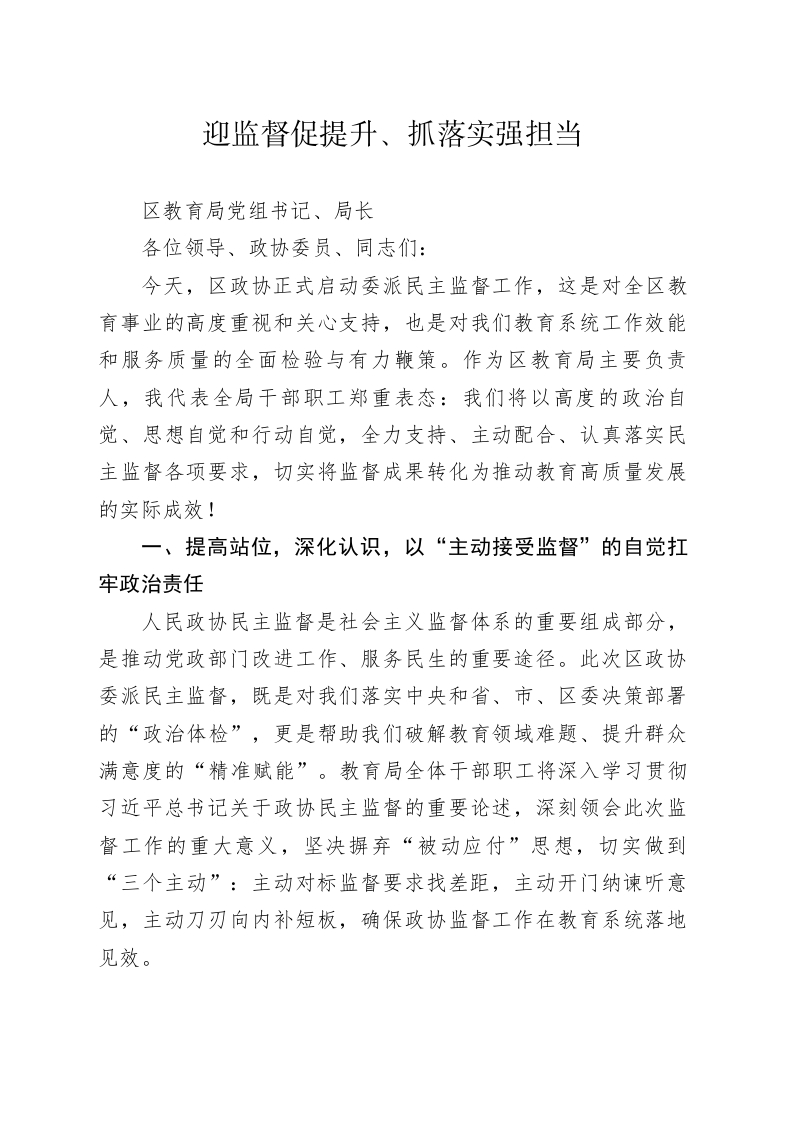 迎监督促提升、抓落实强担当区教育局党组书记、局长各位领导、政协委员、同志们:今天,区政协正式启动委派民主监督工作,这是对全区教育事业的高度重视和关心支持,也是对我们教育系统工作效能和服务质量的全面检验与有力鞭策。作为区教育局主要负责人,我代表全局干部职工郑重表态:我们将以高度的政治自觉、思想自觉和行动自觉,全力支持、主动配合、认真落实民主监督各项要求,切实将监督成果转化为推动教育高质量发展的实际成效!一、提高站位,深化认识,以“主动接受监督”的自觉扛牢政治责任人民政协民主监督是社会主义监督体系的重要组成部分,是推动党政部门改进工作、服务民生的重要途径。此次区政协委派民主监督,既是对我们落实中央和省、市、区委决策部署的“政治体检”,更是帮助我们破解教育领域难题、提升群众满意度的“精准赋能”。教育局全体干部职工将深入学习贯彻习近平总书记关于政协民主监督的重要论述,深刻领会此次监督工作的重大意义,坚决摒弃“被动应付”思想,切实做到“三个主动”:主动对标监督要求找差距,主动开门纳谏听意见,主动刀刃向内补短板,确保政协监督工作在教育系统落地见效。二、全力配合,高效保障,以“开门迎监督”的态度抓实工作对接成立民主监督工作对接专班,制定专项工作方案,明确分管领导、责任科室和联络员,形成“一把手亲自抓、分管领导全程跟、责任科室具体办”的工作体系。主动邀请监督小组参加教育系统重要会议、重大项目和重点工作的研究部署,及时提供相关资料和数据,为政协委员调研、视察、座谈等工作提供全方位保障。对监督过程中发现的问题、提出的建议,我们将建立问题清单、责任清单和整改台账,坚持边查边改、即知即改;对需长期推进的难点问题,制定阶段性整改计划,定期向监督小组汇报进展,确保事事有回音、件件见成效。三、聚焦重点,靶向发力,以“整改促提升”的决心推动教育高质量发展我们将紧盯“义务教育优质均衡”“教育资源优化配置”“教育教学质量提升”等重点工作,借助政协监督力量,加快破解资源布局、师资建设、教学质量等瓶颈问题。同时,不断改进工作作风,严查“不作为、慢作为”现象,坚决整治群众反映强烈的师德师风、校园安全、招生入学等领域问题,以监督促廉洁、以整改促担当。针对监督中提出的民生实事、教育热点难点等,我们将主动对接监督小组开展联合调研,完善政策举措,用实实在在的整改成果增进民生福祉。四、建章立制,长效巩固,以“监督常态化”的理念夯实发展根基
