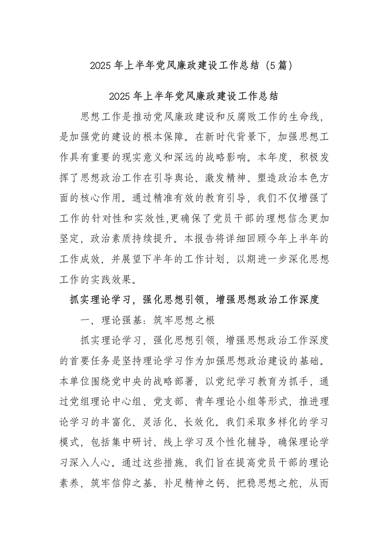 2025年上半年党风廉政建设工作总结(5篇)2025年上半年党风廉政建设工作总结思想工作是推动党风廉政建设和反腐败工作的生命线,是加强党的建设的根本保障。在新时代背景下,加强思想工作具有重要的现实意义和深远的战略影响。本年度,积极发挥了思想政治工作在引导舆论、激发精神、塑造政治本色方面的核心作用。通过精准有效的教育引导,我们不仅增强了工作的针对性和实效性,更确保了党员干部的理想信念更加坚定,政治素质持续提升。本报告将详细回顾今年上半年的工作成效,并展望下半年的工作计划,以期进一步深化思想工作的实践效果。抓实理论学习,强化思想引领,增强思想政治工作深度一、理论强基:筑牢思想之根抓实理论学习,强化思想引领,增强思想政治工作深度的首要任务是坚持理论学习作为加强思想政治建设的基础。本单位围绕党中央的战略部署,以党纪学习教育为抓手,通过党组理论中心组、党支部、青年理论小组等形式,推进理论学习的丰富化、灵活化、长效化。我们采取多样化的学习模式,包括集中研讨、线上学习及个性化辅导,确保理论学习深入人心。通过这些措施,我们旨在提高党员干部的理论素养,筑牢信仰之基、补足精神之钙、把稳思想之舵,从而显着增强基层党组织的凝聚力和战斗力。此外,结合当前中心工作和党纪学习教育,我们加强了关于基层组织建设、乡村振兴、精神文明创建、安全生产等方面的知识学习,从理论与实践两个维度全面强化党员干部的能力。二、创新激励:活化学习之道本年度,我们通过创新方式激发学习热情,不断寻求守正创新的学习方法。采取线上线下结合的学习方式,组织丰富多彩的主题党日活动,进一步活化思想政治工作。依托理论学习中心组、“三会一课”主题党日、书记讲党课、举办读书班等传统形式,我们定期开展集中学习和研讨,确保每一次学习都能触及心灵、引发思考。特别对于身体不便、年龄偏大的老党员,我们采取“送学上门”的方式,确保他们也能及时更新知识、参与讨论。对于流动党员,利用AAA、学习强国、腾讯会议等网络平台,开展网络送学活动,实现云学习、云交流,确保无论身处何地,党员们都能够参与到学习中来,这样的措施极大地提升了学习的广泛性和效果性。三、制度保障:确保学习之效为保障理论学习的长效性,年初我们就已经制定了党组理论中心组学习计划、各支部理论学习方案及党员培训计划,将学习目标具体化、学习内容明确化、工作措施精细化、责