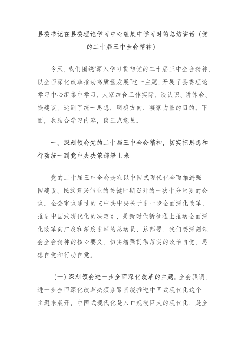 县委书记在县委理论学习中心组集中学习时的总结讲话(党的二十届三中全会精神)今天,我们围绕“深入学习贯彻党的二十届三中全会精神,以全面深化改革推动高质量发展”这一主题,开展了县委理论学习中心组集中学习。大家结合工作实际,谈认识、讲体会、提建议,达到了统一思想、明确方向、凝聚力量的目的。下面,我结合学习内容,谈三点意见。一、深刻领会党的二十届三中全会精神,切实把思想和行动统一到党中央决策部署上来党的二十届三中全会是在以中国式现代化全面推进强国建设、民族复兴伟业的关键时期召开的一次十分重要的会议。全会审议通过的《中共中央关于进一步全面深化改革、推进中国式现代化的决定》,是新时代新征程上推动全面深化改革向广度和深度进军的总动员、总部署。我们要深刻领会全会精神的核心要义,切实增强贯彻落实的政治自觉、思想自觉和行动自觉。(一)深刻领会进一步全面深化改革的主题。全会强调,进一步全面深化改革必须紧紧围绕推进中国式现代化这个主题来展开。中国式现代化是人口规模巨大的现代化、是全体人民共同富裕的现代化、是物质文明和精神文明相协调的现代化、是人与自然和谐共生的现代化、是走和平发展道路的现代化。这一论断深刻阐明了中国式现代化的本质特征和基本内涵。我们要立足县情实际,找准改革切入点和突破口,以经济体制改革为牵引,统筹推进民主法治、文化、社会、生态文明等各领域改革,为中国式现代化县域实践注入强劲动力。(二)深刻领会进一步全面深化改革的重大原则。全会提出“六个坚持”的重大原则,即坚持党的全面领导、坚持以人民为中心、坚持守正创新、坚持以制度建设为主线、坚持全面依法治国、坚持系统观念。这“六个坚持”是改革开放以来特别是新时代全面深化改革的宝贵经验总结,是推动改革行稳致远的方法论。我们要准确把握“六个坚持”的深刻内涵和实践要求,确保改革始终沿着正确方向前进。比如,在推进乡村振兴中,既要坚持农村土地集体所有制不动摇,又要创新农业经营体制,培育新型农业经营主体;在推进基层治理中,既要坚持党的领导,又要发挥群众主体作用,构建共建共治共享的治理格局。(三)深刻领会进一步全面深化改革的重大举措。全会部署了未来五年的重大改革举措,涉及经济、政治、文化、社会、生态文明、国家安全、国防和军队等各个领域。我们