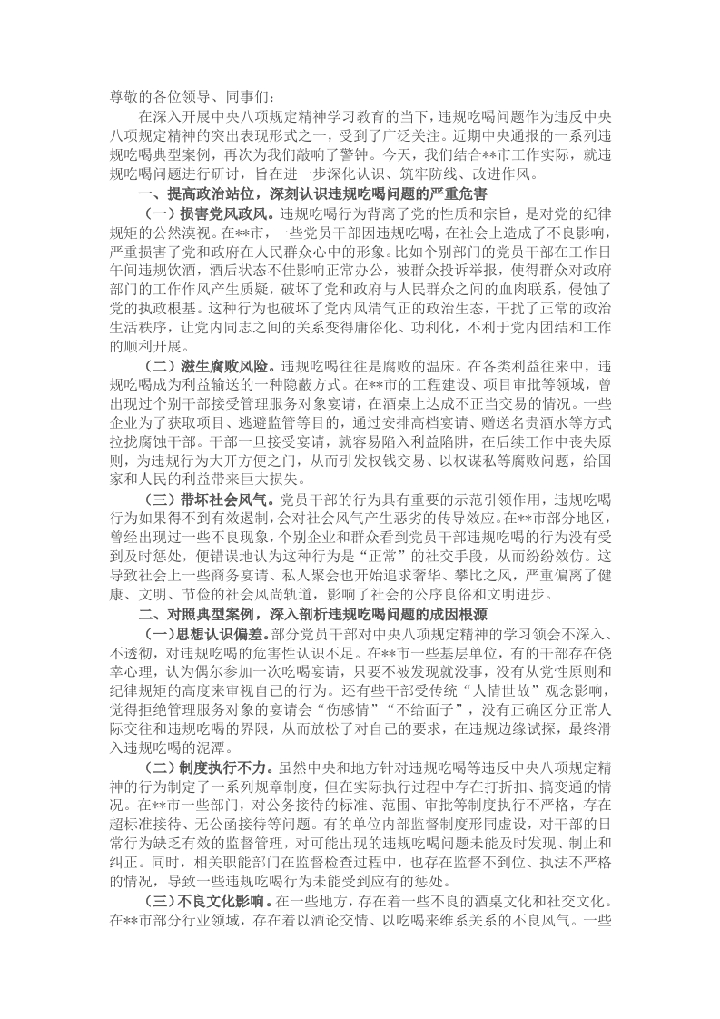 尊敬的各位领导、同事们:在深入开展中央八项规定精神学习教育的当下,违规吃喝问题作为违反中央八项规定精神的突出表现形式之一,受到了广泛关注。近期中央通报的一系列违规吃喝典型案例,再次为我们敲响了警钟。今天,我们结合*市工作实际,就违规吃喝问题进行研讨,旨在进一步深化认识、筑牢防线、改进作风。一、提高政治站位,深刻认识违规吃喝问题的严重危害(一)损害党风政风。违规吃喝行为背离了党的性质和宗旨,是对党的纪律规矩的公然漠视。在**市,一些党员干部因违规吃喝,在社会上造成了不良影响,严重损害了党和政府在人民群众心中的形象。比如个别部门的党员干部在工作日午间违规饮酒,酒后状态不佳影响正常办公,被群众投诉举报,使得群众对政府部门的工作作风产生质疑,破坏了党和政府与人民群众之间的血肉联系,侵蚀了党的执政根基。这种行为也破坏了党内风清气正的政治生态,干扰了正常的政治生活秩序,让党内同志之间的关系变得庸俗化、功利化,不利于党内团结和工作的顺利开展。(二)滋生腐败风险。违规吃喝往往是腐败的温床。在各类利益往来中,违规吃喝成为利益输送的一种隐蔽方式。在**市的工程建设、项目审批等领域,曾出现过个别干部接受管理服务对象宴请,在酒桌上达成不正当交易的情况。一些企业为了获取项目、逃避监管等目的,通过安排高档宴请、赠送名贵酒水等方式拉拢腐蚀干部。干部一旦接受宴请,就容易陷入利益陷阱,在后续工作中丧失原则,为违规行为大开方便之门,从而引发权钱交易、以权谋私等腐败问题,给国家和人民的利益带来巨大损失。(三)带坏社会风气。党员干部的行为具有重要的示范引领作用,违规吃喝行为如果得不到有效遏制,会对社会风气产生恶劣的传导效应。在*市部分地区,曾经出现过一些不良现象,个别企业和群众看到党员干部违规吃喝的行为没有受到及时惩处,便错误地认为这种行为是“正常”的社交手段,从而纷纷效仿。这导致社会上一些商务宴请、私人聚会也开始追求奢华、攀比之风,严重偏离了健康、文明、节俭的社会风尚轨道,影响了社会的公序良俗和文明进步。二、对照典型案例,深入剖析违规吃喝问题的成因根源(一)思想认识偏差。部分党员干部对中央八项规定精神的学习领会不深入、不透彻,对违规吃喝的危害性认识不足。在**市一些基层单位,有的干部存在侥幸心理,认为偶尔参加一次吃喝宴请,只要不被发现就没事,没有从党性原则和纪律规矩的高度来审视自己的行为。还有些干部受传统“人情世故”观念影响,觉得拒绝管理服务对象的宴请会“伤感情”“不给面子”,没有正确区分正常人际交往和违规吃喝的界限,从而放松了对自己的要求,在违规边缘试探,最终滑入违规吃喝的泥潭。(二)制度执行不力。虽然中央和地方针对违规吃喝等违反中央八项规定精神的行为制定了一系列规章制度,但在实际执行过程中存在打折扣、搞变通的情况。在**市一些部门,对公务接待的标准、范围、审批等制度执行不严格,存在超标准接待、无公函接待等问题。有的单位内部监督制度形同虚设,对干部的日常行为缺乏有效的监督管理,对可能出现的违规吃喝问题未能及时发现、制止和纠正。同时,相关职能部门在监督检查过程中,也存在监督不到位、执法不严格的情况,导致一些违规吃喝行为未能受到应有的惩处。(三)不良文化影响。在一些地方,存在着一些不良的酒桌文化和社交文化。在*市部分行业领域,存在着以酒论交情、以吃喝来维系关系的不良风气。一些企业为了拓展业务、获取资源,热衷于通过吃喝宴请等方式与干部建立联系。这种不良文化氛围对党员干部形成了一种无形的压力和诱惑,一些意志不坚定的干部容易在这种环境中随波逐流,陷入违规吃喝的怪圈。此外,一些地方还存在着攀比吃喝档次、追求奢华享受的现象,这种不良风气也在一定程度上助长了违规吃喝问题的滋生。三、结合*实际,全面排查违规吃喝问题的具体表现(一)公务接待中的违规吃喝。在**市部分单位的公务接待中,存在超标准接待的问题。有的单位在安排公务用餐时,不按照规定标准执行,擅自提高菜品档次,上高档烟酒、名贵菜肴。例如,个别部门在接待外地考察团时,超标准安排豪华酒店用餐,每桌费用远超规定标准,造成了不必要的浪费。还有无公函接待的情况时有发生,一些单位在没有正式公函的情况下,仍然违规接待,甚至通过编造公函等方式掩盖违规行为。此外,陪餐人数超标的问题也较为突出,有的单位在接待过程中,安排过多的人员陪餐,不仅影响了工作效率,也增加了接待成本。(二)与管理服务对象的违规吃喝。在*市的一些执法监管部门和具有审批职能的单位,存在着党员干部接受管理服务对象宴请的现象。一些干部在对企业进行检查、审批等工作过程中,接受企业安排的宴请,在吃喝过程中可能会出现放松监管、违规审批等行为。比如,在环保执法检查中,个别执法人员接受被检查企业的宴请,在酒桌上答应降低执法标准、延缓处罚等,严重损害了执法的公正性和权威性。还有一些干部在节假日期间,接受管理服务对象的邀请,参加私人聚会性质的吃喝活动,表面上是私人交往,实际上是利用职权谋取私利的一种隐蔽方式。(三)违规使用公款吃喝。在*市部分基层单位,存在违