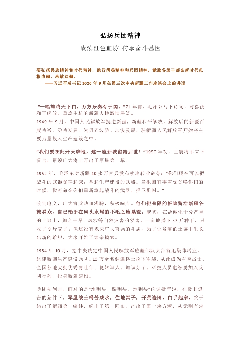 弘扬兵团精神赓续红色血脉传承奋斗基因要弘扬民族精神和时代精神,践行胡杨精神和兵团精神,激励各级干部在新时代扎根边疆、奉献边疆。一习近平总书记2020年9月在第三次中央新疆工作座谈会上的讲话“一唱雄鸡天下白,万方乐奏有于阗。”71年前,毛泽东写下诗句,对喜获和平解放、重焕生机的新疆大地激情展望。1949年9月,中国人民解放军挺进新疆,新疆和平解放。解放后的新疆百废待兴,亟待发展。为巩固边防、加快发展,驻新疆人民解放军开始将主要力量投入生产建设之中。“我们要在此开天辟地,建一座新城留给后世!”1950年初,王震将军立下誓言,带领广大将士开出了军垦第一犁。1952年,毛泽东对新疆10多万官兵发布就地转业命令:“你们现在可以把战斗的武器保存起来,拿起生产建设的武器。当祖国有事需要召唤你们的时候,我将命令你们重新拿起战斗的武器,捍卫祖国。”收到电文,广大官兵热血沸腾,积极响应。他们把有限的耕地留给新疆各族群众,自己动手在风头水尾的不毛之地垦荒。起初,在盐碱化十分严重的土地上,加之干旱、风沙等自然灾害的侵害,一亩地播下37斤种子,只收了9斤麦子。但这没有熄灭广大官兵的斗志,为了让贫瘠的土壤中生长出新的希望,大家开始了艰辛摸索。1954年10月,党中央决定中国人民解放军驻疆部队大部就地集体转业,组建新疆生产建设兵团。10万余名驻疆将士脱下军装,从此成为军垦战士。全国各地大批优秀青壮年、复转军人、知识分子、科技人员也纷纷加入兵团行列,投身新疆建设。兵团初创时,面对的是“水到头、路到头、地到头”的戈壁荒漠,在极其艰苦的条件下,军垦战士喝苦咸水,住地窝子,开荒造田,白手起家,终于纺出了新疆第一缕纱,织出了第一匹布,产出了第一块方糖,从无到有建起一个个农牧团场,逐步建立起涵盖食品加工、轻工纺织、钢铁、煤炭等门类的工业体系,创造了人类改造戈壁沙漠的奇迹。新疆生产建设兵团第八师所在的石河子市,起初是一片戈壁荒滩,只有几家车马店和卖馕人家,很快崛起为兵团人自己选址、规划、建造的第一座城市。今天的石河子市,是全国最重要的优质商品棉生产地之一,也是城市绿化覆盖率高达42%的“沙漠绿洲”,享有“戈壁明珠”的美名。在石河子市建设带动下,新疆生产建设兵团先后建起一大批环境优美、城乡结合、农工商一体化的军垦城镇。新疆生产建设兵团综合实力不断壮大,不仅成为新疆工业的重要奠基者,更成为新疆经济建设的重要组成部分。如今,新疆每三亩半耕地中,就有一亩是兵团人开垦的。在艰辛付出、开拓进取中收获丰硕成果。兵团建设成就的取得,离不开兵团人坚定理想信念、传承优良传统、一代代接续奋斗的优良作风。“当年没有现在那么多先进的生产工具,挖渠开荒都是肩挑背扛。”新疆生产建设兵团第一师老军垦人杨飞鹏回忆,兵团成立初期,做饭没有油和柴,大家就用盐水摻着苞谷面凑合吃,冬季还要从外地运大白菜和萝卜。“上班一担肥,下班一担草,中午打沙枣,晚上围着火炉剥棉桃”,是当时生活的真实写照。“听风当听歌,下雨当水喝,土块当枕头,芦苇当被窝。”“军垦第一连”老连长胡有才说,“心向祖国,建设边疆,每一个人都是英雄。”上世纪60年代,上海知青李梦桃从黄浦江畔来到兵团六师,在位于中蒙边界的北塔山牧场当了一名“赤脚医生”。她长年骑马行走在艰苦荒凉的牧区,为牧民送医送药,把一生奉献给了当地医疗卫生事业。中国工程院院士陈学庚是土生土长的“兵团二代”,他几十年如一日,刻苦钻研农业机械技术,带领团队研究出两代铺膜播种机,实现两次技术革命,助力棉花生产实现质的飞跃。新疆生产建设兵团坚持亦兵亦民、劳武结合、兵民合一,在维护国家统一和新疆社会稳定中发挥了特殊作用,涌现出一批批先进人物:在边境线上