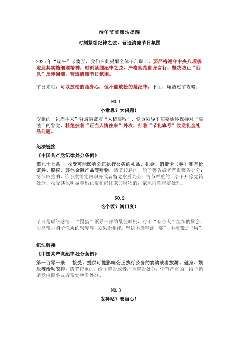 端午节前廉洁提醒时刻紧绷纪律之弦,营造清廉节日氛围2025年“端午”节将至,我们在此提醒全体干部职工,要严格遵守中央八项规定及其实施细则精神,时刻紧绷纪律之弦,严格规范自身言行,坚决防止“四风”反弹回潮,营造清廉节日氛围。节日来临,可以放松的是身心,但不能放松的是纪律。下面,廉洁过节攻略。小意思?大问题!变相的“礼尚往来”背后隐藏着“人情腐败”,党员领导干部要始终保持对“腐蚀”的警觉,杜绝披着“正当人情往来”外衣,打着“节礼旗号”收送礼金礼品问题。纪法链接《中国共产党纪律处分条例》第九十七条收受可能影响公正执行公务的礼品、礼金、消费卡(券)和有价证券、股权、其他金融产品等财物,情节较轻的,给予警告或者严重警告处分:情节较重的,给予撤销党内职务或者留党察看处分:情节严重的,给予开除党籍处分。收受其他明显超出正常礼尚往来的财物的,依照前款规定处理。NO.2吃个饭?鸿门宴!节日是联络感情、“围猎”领导干部的最佳时机,对于“有心人”组织的聚会、明显带小圈子性质的聚餐等,须果断拒绝,坚决不赴糊涂“宴”、不被带进“局”。纪法链接《中国共产党纪律处分条例》第一百零一条接受、提供可能影响公正执行公务的宴请或者旅游、健身、娱乐等活动安排,情节较重的,给予警告或者严重警告处分:情节严重的,给予撤销党内职务或者留党察看处分。NO.3发补贴?要当心!打着过节福利的幌子违规发放津补贴,貌似关心爱护员工,实则是滥用手中权力、践踏纪律红线,切莫把“福利”变“腐利”。纪法链接《中国共产党纪律处分条例》第一百一十四条违反有关规定自定薪酬或者滥发津贴、补贴、奖金、福利等,对直接责任者和领导责任者,情节较轻的,给予警告或者严重警告处分;情节较重的,给予撒销党内职务或者留党察看处分:情节严重的,给予开除党籍处分。婚丧宴?别违规!操办婚丧喜庆事宜是人之常情,但要明界限、守底线,在规定范围内以适当的形式表达对亲人的感情,应坚持尚俭戒奢、勤俭节约,不可利用婚丧喜庆事宜大操大办或借机敛财。纪法链接《中国共产党纪律处分条例》第一百条利用职权或者职务上的影响操办婚丧喜庆事宜,造成不良影响的,给予警告或者严重警告处分:情节严重的,给予撤销党内职务处分:借机敛财或者有其他侵犯国家、集体和人民利益行为的,从重或者加重处分,直至开除党籍。N0.5借用下?莫为私!节点亦是“考点”,节日期间出去走走看看可以,但不可以觊觎公款出游或者接受服务对象的安排,即使手段再隐蔽,也改变不了违纪实质,切莫让“旅游”变“旅忧”。纪法链接《中国共产党纪律处分条例》第一百一十七条违反有关规定配备、购买、更换、装饰、使用公务交通工具或者有其他违反公务交通工具管理规定的行为,对直接责任者和领导责任者,情节较重的,给予警告或者严重警告处分:情节严重的,给予撤销党内职务或者留党察看处分。