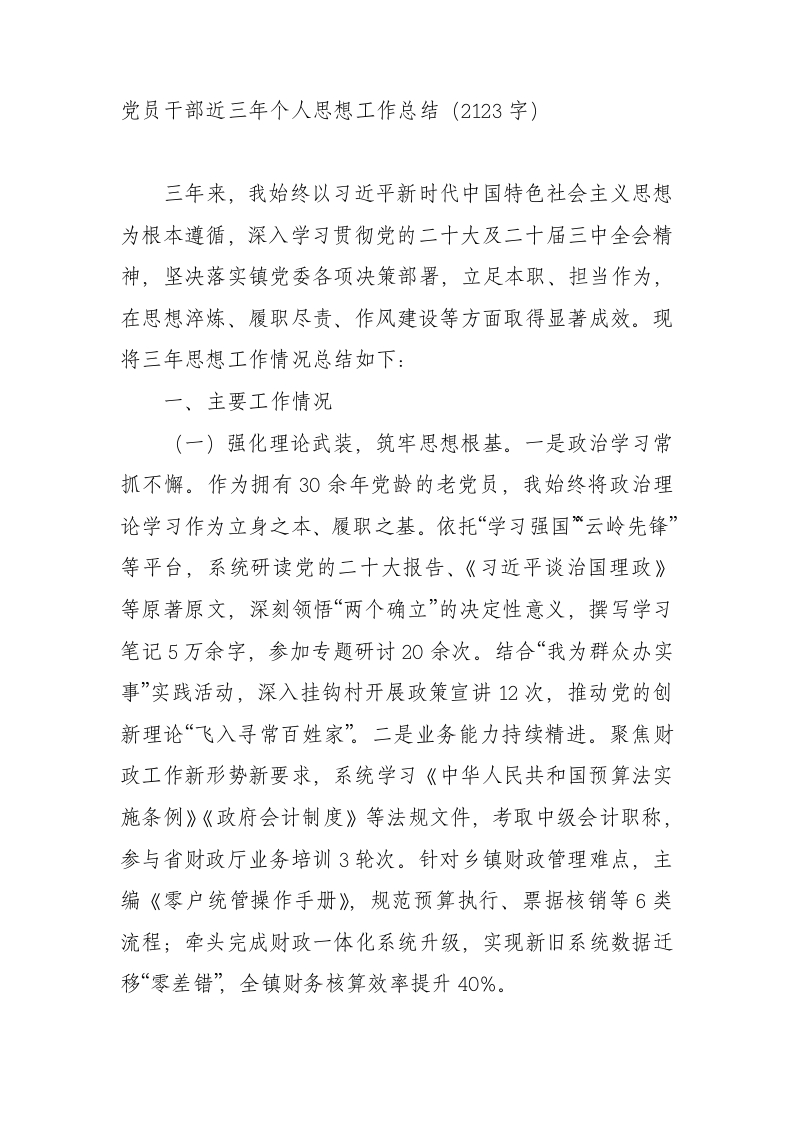 党员千部近三年个人思想工作总结(2123字)三年来,我始终以习近平新时代中国特色社会主义思想为根本遵循,深入学习贯彻党的二十大及二十届三中全会精神,坚决落实镇党委各项决策部署,立足本职、担当作为,在思想淬炼、履职尽责、作风建设等方面取得显著成效。现将三年思想工作情况总结如下:一、主要工作情况(一)强化理论武装,筑牢思想根基。一是政治学习常抓不懈。作为拥有30余年党龄的老党员,我始终将政治理论学习作为立身之本、履职之基。依托“学习强国云岭先锋”等平台,系统研读党的二十大报告、《习近平谈治国理政》等原著原文,深刻领悟“两个确立”的决定性意义,撰写学习笔记5万余字,参加专题研讨20余次。结合“我为群众办实事”实践活动,深入挂钩村开展政策宣讲12次,推动党的创新理论“飞入寻常百姓家”。二是业务能力持续精进。聚焦财政工作新形势新要求,系统学习《中华人民共和国预算法实施条例》《政府会计制度》等法规文件,考取中级会计职称,参与省财政厅业务培训3轮次。针对乡镇财政管理难点,主编《零户统管操作手册》,规范预算执行、票据核销等6类流程;牵头完成财政一体化系统升级,实现新旧系统数据迁移“零差错”全镇财务核算效率提升40%。(二)立足岗位职责,彰显担当作为。一是当好乡镇财政“守门员”作为镇财政所零户统管出纳,始终坚持“资金安全高于一切”原则。三年来累计审核原始凭证1.2万份,退回不规范票据43笔,涉及金额68万元;建立预算执行动态预警机制,通过按月比对用款计划与实际支出,节约非必要开我镇内控制度建设获评“优秀案例”二是构建资金监管“防火墙”。严格执行“收支两条线”管理,实行票据领用“双人双锁”电子台账日清月结制度,去年率先完成全镇42个单位票据电子化全覆盖。创新开展“三查三对”专项行动(查资金流向、查账户余额、查审批手续,对账目、对凭证、对实物),发现并整改账实不符问题7项,相关经验被县财政局发文推广。三是锻造乡村振兴“助推器”主动参与挂钩村耕地保护专项整治,协调解决土地纠纷3起,推动复垦撂荒地80亩;协助申报产业扶持项目2个,争取资金45万元。在疫情防控关键期,创新“无接触报销”模式,保障防疫物资采购资金拨付“不过夜”相关工作获县级通报表扬。(三)严守纪律规矩,永葆清廉本色。一是作风建设抓在日常。严格落实中央八项规定精神,三年来拒收礼品礼金6人次,压缩公务接待费用30%。建立家庭廉政档案,签订《家属廉洁承诺书》,定期开展“廉政家访”,坚决杜绝“亲属插手工程代持资产”等问题。2023年获评全镇“清风家庭”称