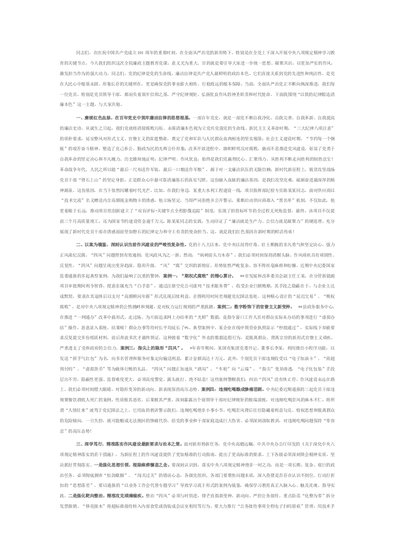 同志们,在肤祝中国共产党成立104周年的重要刻,在全面从严治党的新形势下,特别是在全党上下深入开展中央八项规定精神学习教有的关键节点,今天我《阻织这次全院康攻主题教有党课。意义尤为重大。目的就是要引导大家进一步统一思想、凝聚共识,以更加严实的作风,激发担当作为的强大动力.同志们,党的配律是党的生命线,康洁自律是共产党人最鲜明的攻治本色。它们直接关系到党的先进性和纯洁性,是党在人民心中根基永固、形象长存的关键所在,更是确保党的事业魏火相传、行稳致远的根本章。当前。全面从严治觉正不断向纵深推进,我们每康本色”这一主题,与大家共勉一、度线红色血脉,在百年党史中筑牢康洁拍律的思想根基一部百年党史,就是一部党不断自我净化、自我完善、自我革新、自我提高的康洁史诗.从诞生之日起,我们党就将清除腐散污垢、永菜清康本色视为立党兴党强党的生命线。新民主主义苹命时期。“三大纪律八项注意”自我革命的坚定决心和不凡魏力。历史雄辩地旺明:纪律严明、作风代良,始终是我党赢得民心、汇聚伟力、从胜利不断走向胜利的制胜法宝:苹命战争年代,人民之所以能“最后一尺布送作军装,最后一口粮送作军粮”,源于对一支康洁队伍的无限信桃:新时代新征程上,脱贫攻坚战场党员干都“背石上山”的坚定身彩,正是群众心中最可靠清康基石的真实写黑。这份融入血咏的康洁基因。是我们攻坚克难、砥雨奋进最深厚的精神源泉。这份基因。在当下依然闪耀着倒代光芒。比如,在我们身边,某重大水利工程建设一线。项目指挥配检专员陈某某同志,面对供应商以“技术交流”名义赠送内含高现金购物卡的诱感,他立场坚定,当即严词拒跑并公开答示。果断启动供应商准入“需名单”机制。不仅如此他更着跟于长远。推动项目组心新建立了“双宜评标+关键节点全程影像追踪”制度,实现了招投标环节的全过程无死角监督。最终,该项目不仅提前三个月高质量竣工,还为国家节钩建设资金逾干万元陈某某同志的实践,生动印证了“康洁就是生产力、公慎力就是凝聚力”的便道理,充分二、以案为镜鉴,深刻以识当前作风建设的严峻性复杂性。党的十八大以来,党中央以刮付柠毒、壮士腕的非凡勇气和坚定决心,强力项目审批期阿利令智昏,授意亲属充当“白手套”,通过注册空壳公可虚列“技术服务费”,收受企业巨额贿赂。其手段之隐蔽在于,与企业主达成默契,要求在其遥休后以支付“高额顺问年藕”形式兑现后球利登,企图利用时间差规避党纪国法惩处。这种精心设计的“延迟交易”、“期权在推进“一网通办”改革中籍形式、走过场。为片面追求网上办结率的“光鲜”数据。竟指令窗口工作人员对群众实际未办结的事项进行“虚拟办发送“拼手气红包”为名。向多名管理和服务对象定向输送利益。累计金额高达十万元:此外,个别觉员干御速规收受以“电子知油卡”、“商超忍”的高压态势!三、深学笃行,精准落实作风建设最新要求与治本之策。而对新形势新任务,党中央高赠远隔,中共中央办公厅印发的《关于深化中央八项规定精神落实的若干措施》,为新征程上的作风建设提供了更加精准的行动指南,提出了更高际准的要求。上下各级必须深刻额会精神实质,坚扣的“思想落差”。要以通报的“以业务工作会代普专题学习”导致学习流于形式的案例为镜鉴,确保学习教有真正入脑入心、触及灵魂、指导实发票报销、“移花接木”将超标准接待转入内都食堂或伪装成会议室租用等行为。要大力推行“公务接待事项全程电子扫码留粮”管理,用技术手严格落实“行程计划事前事后双备案、费用支付一律使用电子凭还”的性制度。整治收受歪风。高度警偶通过快递物流寄送“上持产”包裹、利用拟货币和第三方支付平台进行利输送等新型行随受釉形式。要抓紧建立健全“党员干都收受礼品登记备案制度”和“对异常快递往来实施主动简查机制”,织密织丰监督路。三是强化制别性,务实长教长治之基。智赋能监督。我院(或可结合单位实际,如“目推广应用的”)“四风问题大数据智能顶警平台”成效显著,通过对公务用车运行轨迹实时监控、高频次大额发票报销信息交叉比对、异常消费行为数据筛查等手原则。始终在攻治立场、攻治方向、攻治原则、攻治道路上同党中央保持高度一致。对于中央八项规定精神落实情况要常怀敢畏之心。我建议在我院(或本单位)层面建立并严格执行“对标对表周自查、落实成效月通报”机制。确保党中央决策御署和各项纪律要求不折不扣落到实数、政令将通、令行禁止。二是炼过硬作风,做务实担当的“实干家”·要大力得导并躬身践行“一线工作法”,身子下沉。重心下移,深入基层、深入群众深入实际,用心用情用力研究破除形式主义、官僚主义的有效方法,不断横升服务效能。要认真学习借鉴“厅长局长)窗口走流程”活动的宝贵经验,推动我院(本单位)领导干部定期以普通办事人员身份,亲身体验服务流程,找准服务中的堵点、痛点、盲点,并推动精准整改流程繁高度重视家风建设,严格落实《措》中的相关要求。我要求,全院处级以上领导干都(可根紧单位层级整)须于了月咸前,严肃规范组织签订《领导干家属康洁自律承诺书》,本人要带头示范、